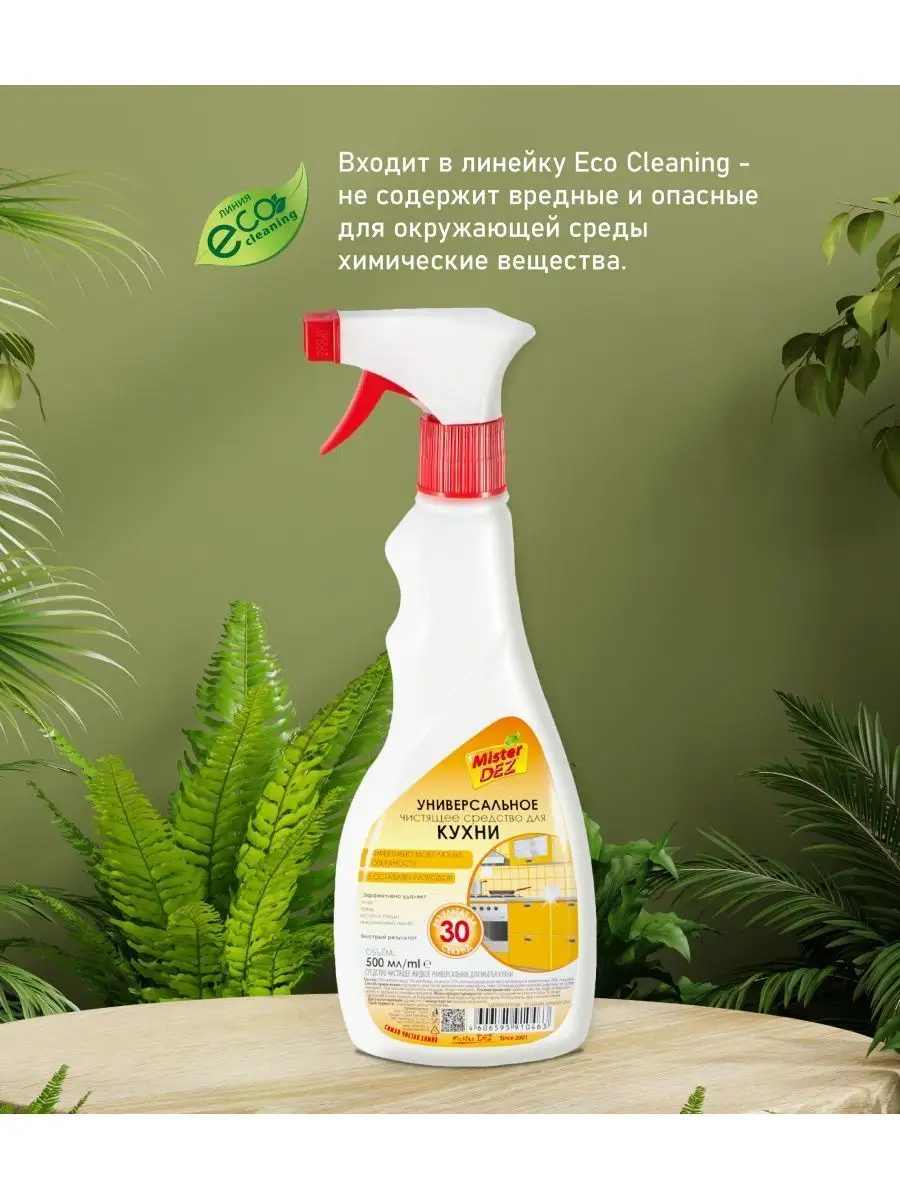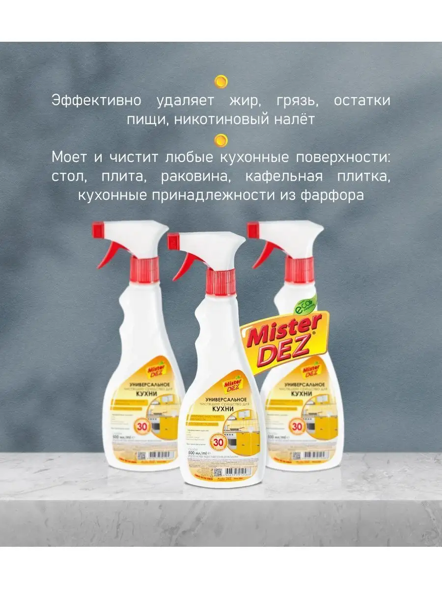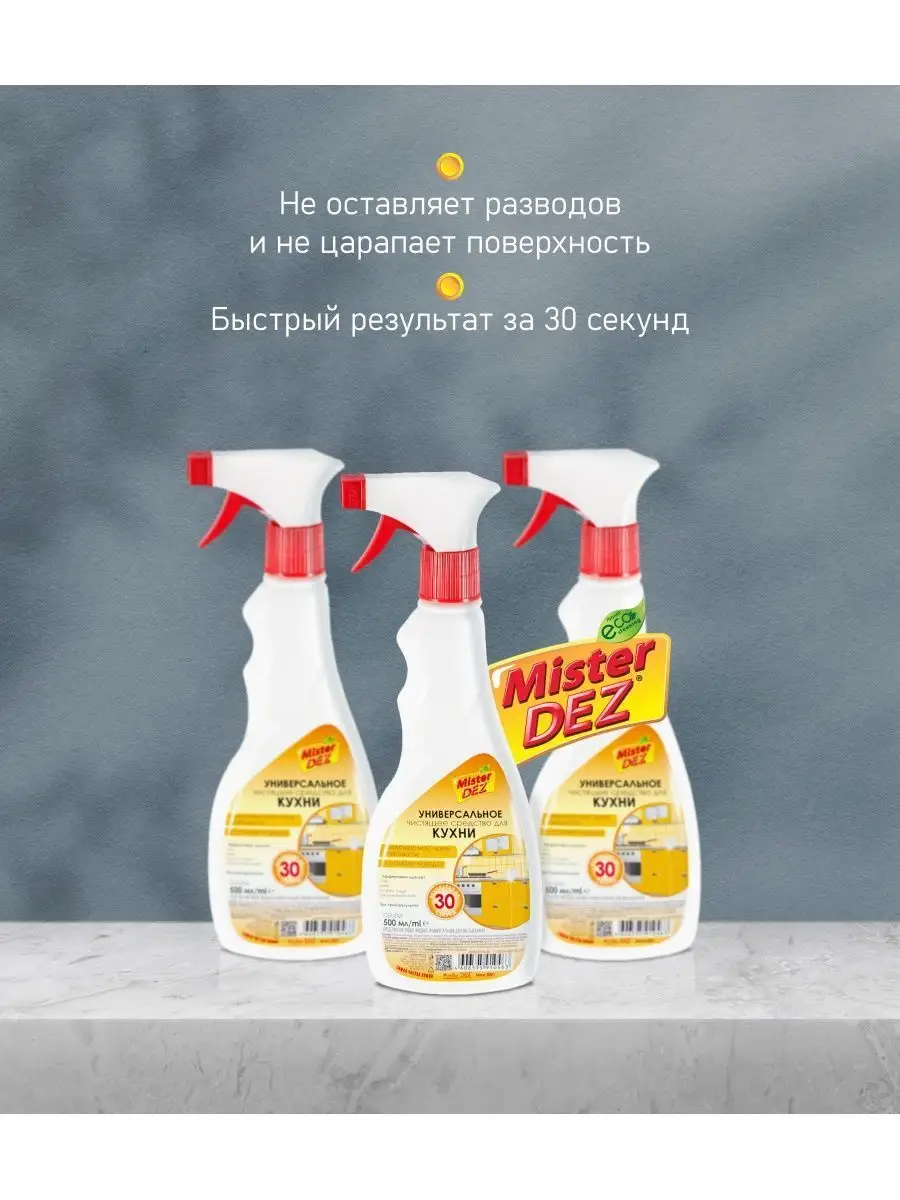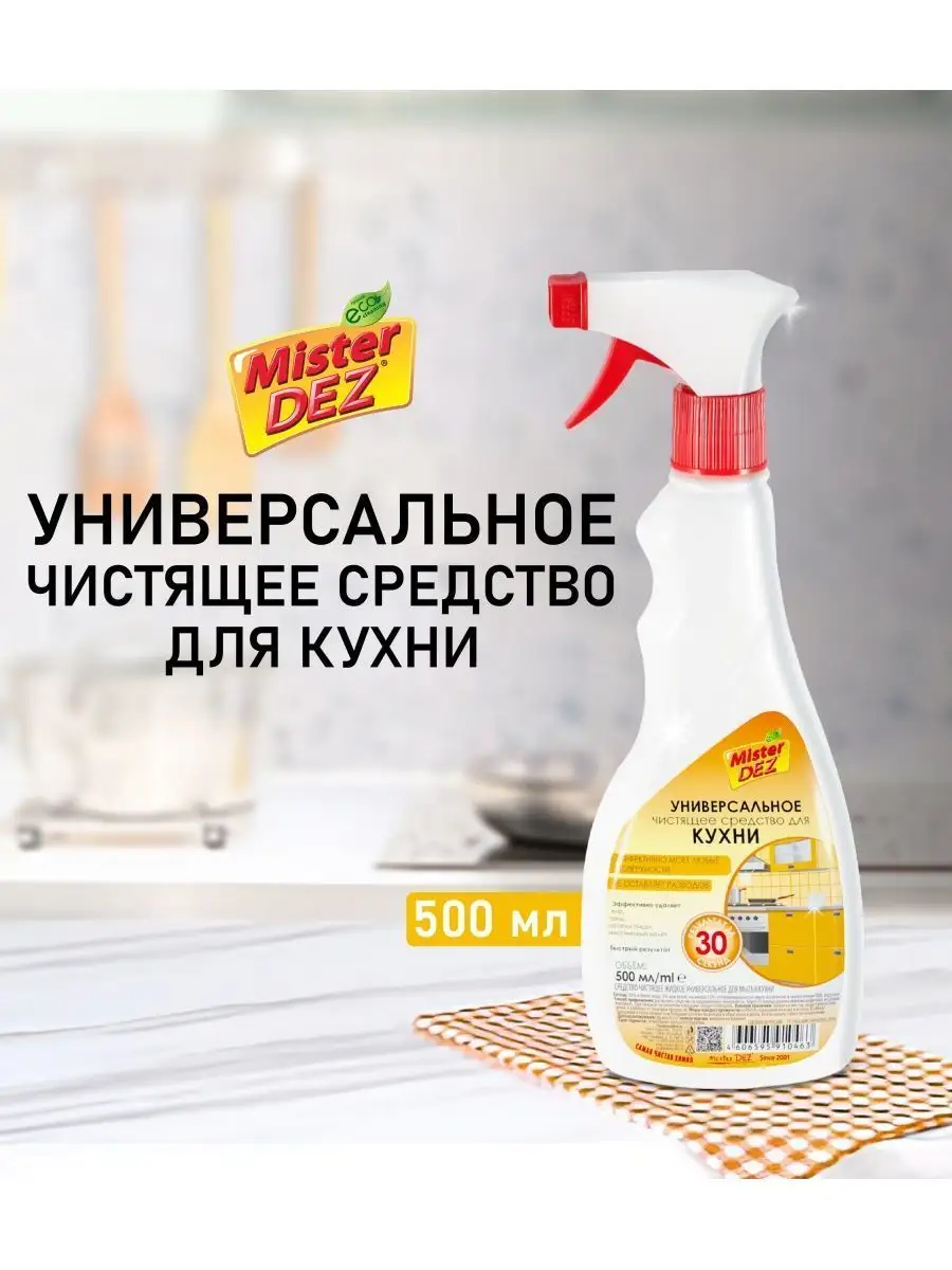 Описание: Универсальное чистящее средство для кухни Mister Dez разработано для эффективной и бережной очистки любых кухонных поверхностей: столешницы, шкафы, раковина, кухонная плита, холодильник, микроволновая печь. Средство для кухни легко и быстро удаляет жир, грязь, остатки пищи, не оставляя царапин. Спрей для уборки с надежной формулой не оставляет разводы и царапины, возвращает первозданную чистоту столешницам, плитам, раковинам, кафельной плитке, кухонным фасадам, принадлежностям из фарфора, не имеет химического запаха. Средство для мытья плит входит в линейку Eco Cleaning - не содержит вредные и опасные для окружающей среды химические вещества. Попробуйте другие чистящие средства для уборки дома и на кухне, в ванной и душе Mister Dez: для стекол и зеркал, для стирки, сантехники, душевых кабин, унитаза, посудомоечных и стиральных машин. Средство для стеклокерамики это идеально средство антижир для плит, не царапает плиты, не имеет резкого химического запаха, не оставляет разводов, хорошо смывается. Чистящее средство для кухни для повседневного использования, уничтожает жир, грязь, остатки пищи. Поставка от производителя.