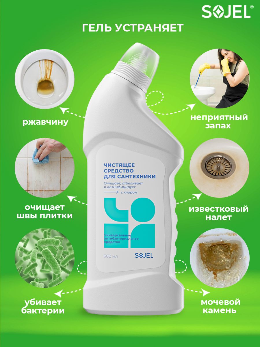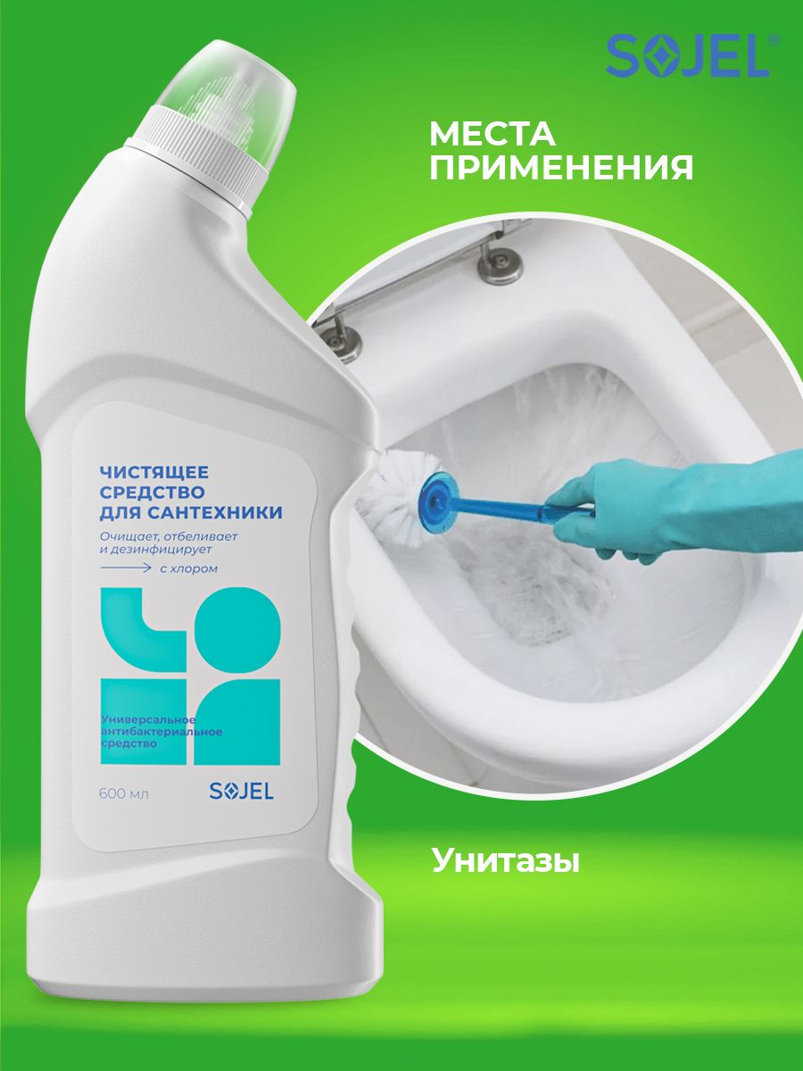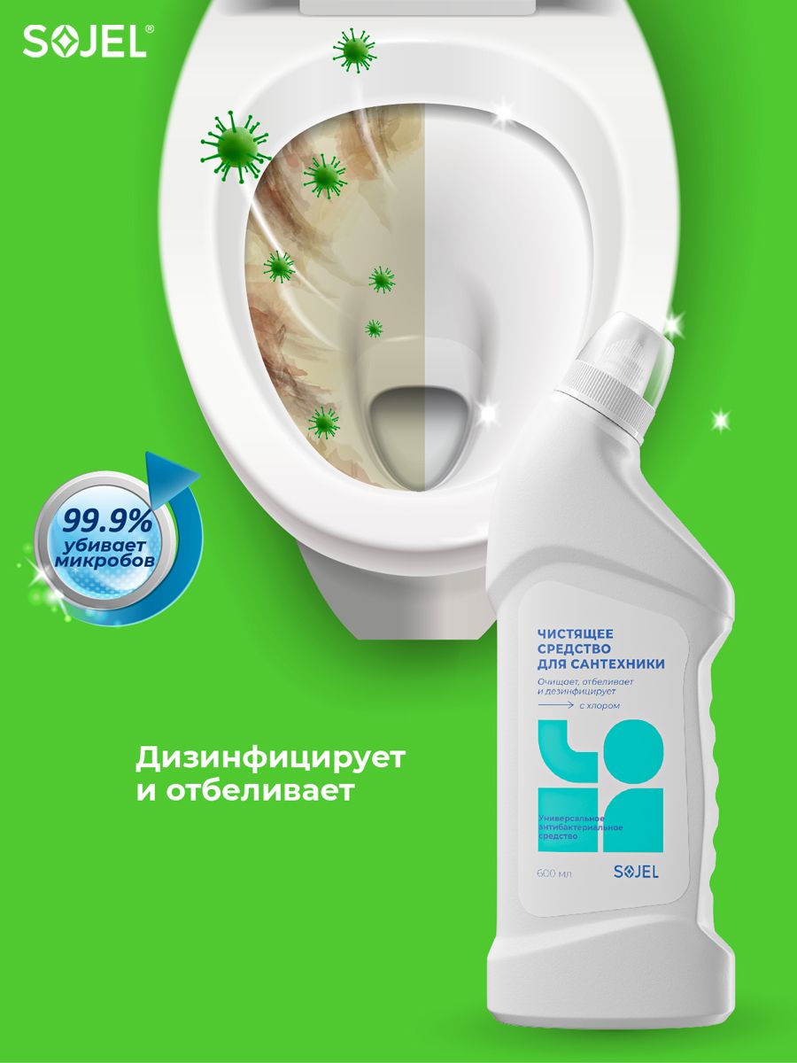 Описание: Чистящее средство для ванной и туалета Sojel поможет легко и быстро привести в порядок сантехнику и уничтожить микробы. Универсальный очиститель подходит для ежедневной уборки всех видов поверхностей в ванных комнатах и санузлах. Профессиональная бытовая химия для чистки, отбеливания и дезинфекции унитазов, ванн, раковин, пола из плитки кафеля, душевых кабин, раковин, кафеля, водостоков, бассейна. Гель для сантехники удаляет ржавчину и известковый налет, устраняет неприятные запахи, не оставляет подтеков, разводов, при постоянном использовании придает поверхности чистоту и сияние. Очиститель для унитаза без труда справится с известковым налетом, солевыми отложениями и жиром. Широкая область применения на кухне, в ванной и туалетных комнатах. Попробуйте чистящее средство для уборки дома и наслаждайтесь чистотой!