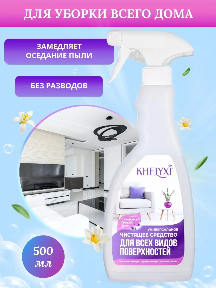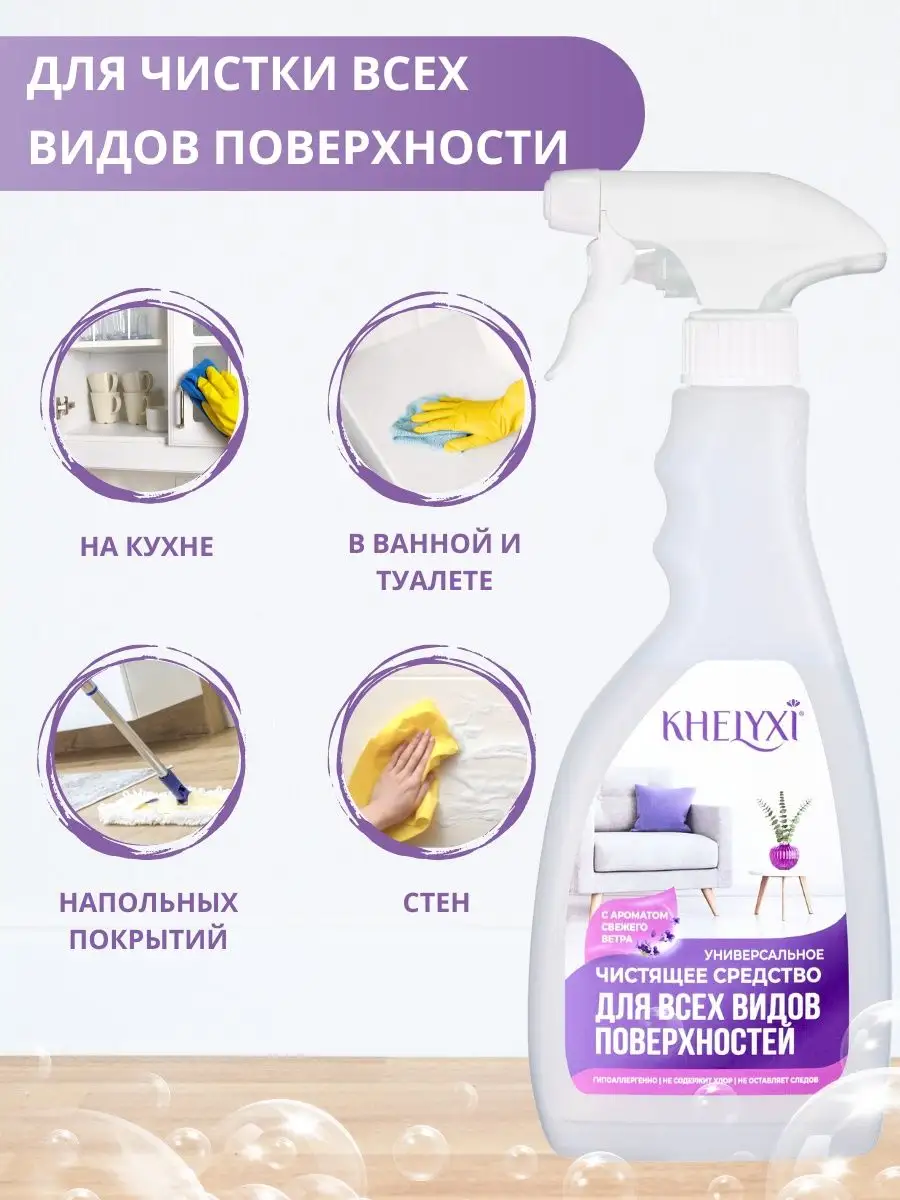 Описание: Универсальное чистящее средство для уборки поверхностей всех видов - безупречно для удаления стойких и застарелых загрязнений на кухне, в ванной, на полу и стенах. Легко справится с пылью (эффект антипыль). Спрей придает блеск. Эффективно удаляет жирные пятна, следы от пальцев и грязь. Подходит для мытья стекол, окон, зеркал и холодильника. Безопасно для мебели. Обладает ароматом свежего ветра и устраняет неприятные запахи. Наш российский бренд бытовой химии KHELYXI (хеликси) создал инновационную линейку экологичных чистящих средств для дома. Наши специалисты разработали новую уникальную формулу основы состава, которая делает их максимально эффективными в борьбе с любыми загрязнениями. Моющие изготовлены на основе неагрессивных биоразлагаемых компонентов. Что это вам дает? Во-первых, эффективность: отлично справляются загрязнениями, при этом не оставляют разводов. Во-вторых, аромат: очень мягкий, нерезкий и нераздражительный. В-третьих, экономичность: за счет усиленного состава, объема в 1000 мл. хватит надолго. Удобная канистра в виде бутылки с пульверизатором позволяет целенаправленно наносить средство на поверхность, а носик дозатор имеет два режима: струя и пена. Безопасно для окружающей среды и септиков.
