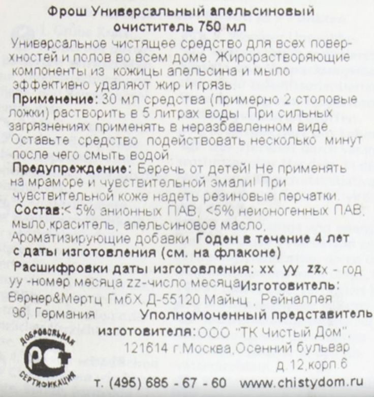 Описание: Универсальный апельсиновый очиститель удаляет известковые отложения, следы от воды и мыла на кухне, в ванной и туалете, оставляя приятный запах апельсина. Средство пригодно для чистки всех видов кафеля, умывальных раковин, кухонной мебели и мебели для ванной. Очень экономичен в использовании, жиры растворяются за счет натурального апельсинового терпена.