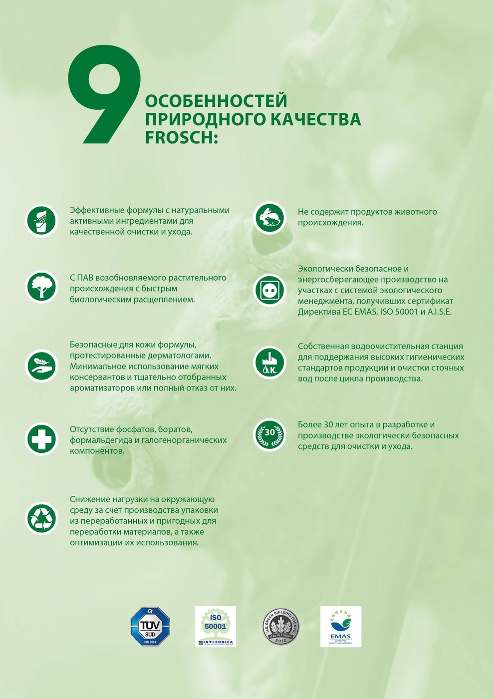 Торговая марка Frosch специализируется на выпуске экологически чистой бытовой химии. Для изготовления своей продукции Frosch использует натуральные природные компоненты. Ассортимент содержит все необходимое для бережного ухода за домом и вещами. Продукция торговой марки Frosch эффективно удаляет загрязнения, оберегает кожу рук и безопасна для окружающей среды. Характеристики: