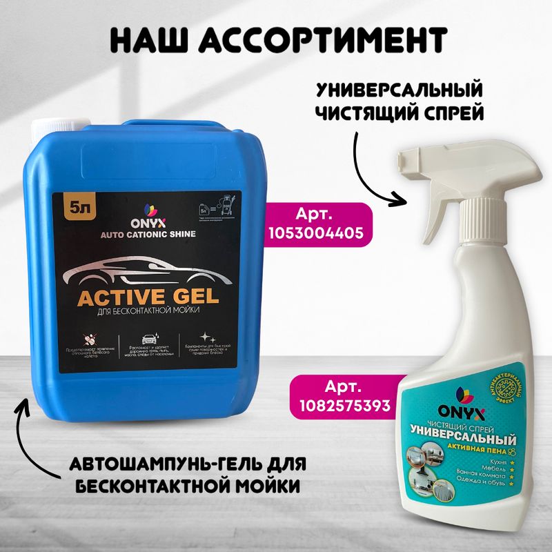Описание: Универсальный чистящий гель-концентрат ONYX Pro CleanОдно средство для уборки всего домаТакже предлагаем вашему вниманиюАвтошампунь для бесконтактной мойки ONYX auto cationic shine Active Gel 5 литров