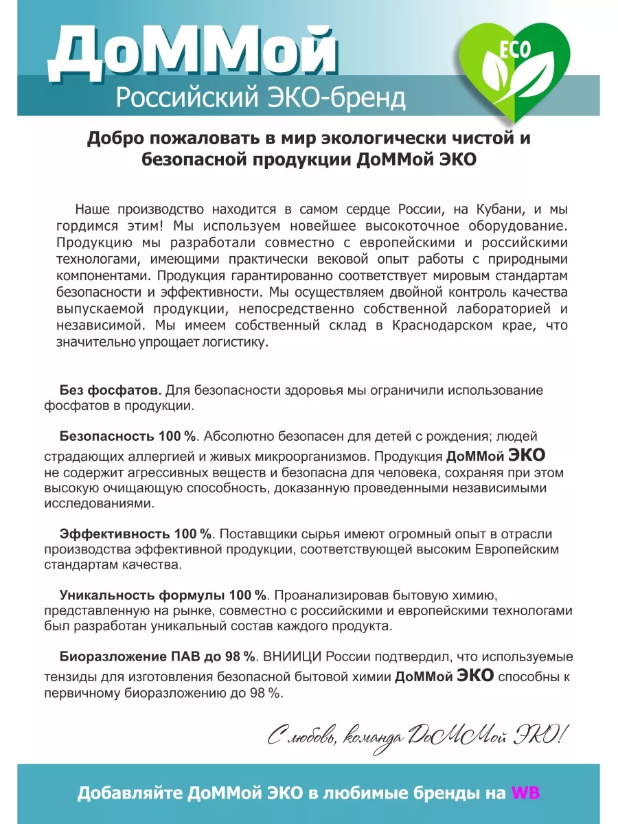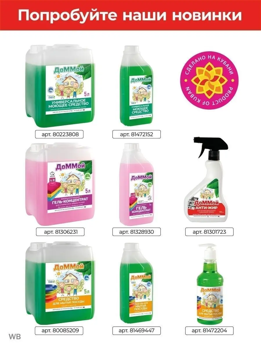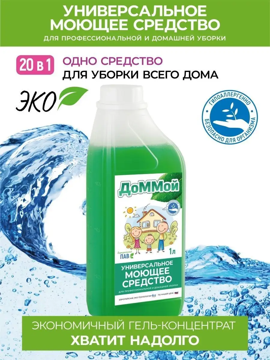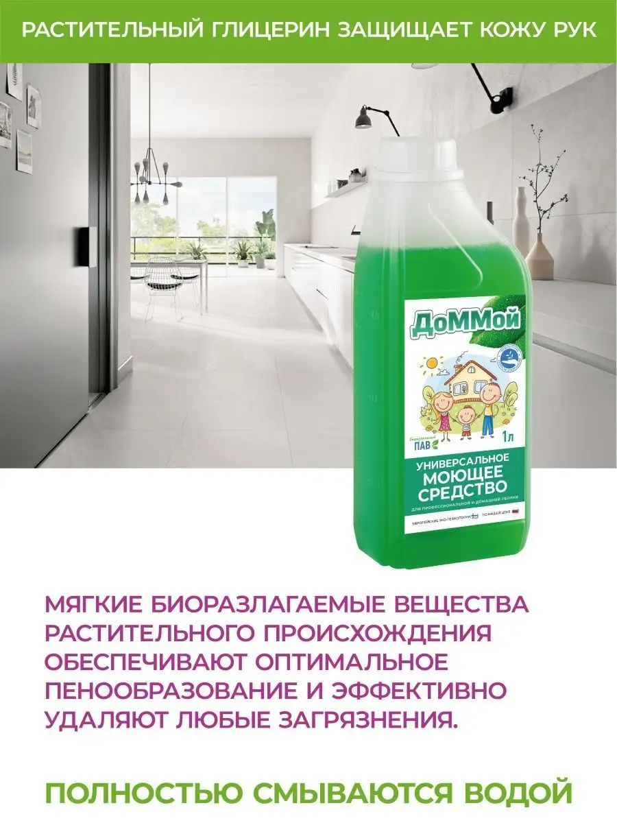 Описание: Биоразлогаемое экологичное универсальное моющее средство для мытья предназначено для ежедневной и генеральной уборки всего дома. Жидкость для уборки антибактериальна и без отдушек. Да, наше средство без запаха, ведь любой аромат, это химия, а мы за натуральные, органические составы! Товары для уборки ДоММой Вы можете смело использовать для мытья поверхностей в домах, где есть дети или аллергики, кормящие мамы или беременные. Компоненты не вредят микрофлоре септических установок, окружающей среде, живым организмам, тк они биоразлагаемы. Оно идеально для разных поверхностей: керамической, стеклянной, фаянсовой, деревянной; для пола, столов, стен, потолка, сантехники, ванны и туалета, кухни. Многофункциональное концентрированное чистящее средство подходит для мытья синтетических и виниловых покрытий, поверхностей из линолеума, дерева, паркета, ламината, асфальта, бетона, облицовочной плитки, стекла, гранита и мрамора. Наше средство послужит Вам в качестве пятновыводителя для мебели (диваны, матрацы и тд), спальных принадлежностей и тд. Средство для уборки, чистки дома, используется в бытовых и подсобных помещениях, на объектах социальной и общественной сферы, отелях, бизнес-центрах, гипермаркетах. Экономично в использовании, всего несколько капель средства обеспечат идеальную чистоту поверхностей, даже при мытье в холодной воде. Безопасно для кожи рук, не вызывает раздражения. Способ применения: Концентрат для уборки разводят в пропорции 1:500 - 1:100 или 2-10 мл на 1 литр воды. Концентрация раствора зависит от характера загрязнения. Если Вы планируете его использовать как средство для мытья посуды, то способ применения: Нанести несколько капель средства на губку или непосредственно на посуду. Для уборки развести в воде . Нанести на поверхность. Затем тщательно ополоснуть водой. .