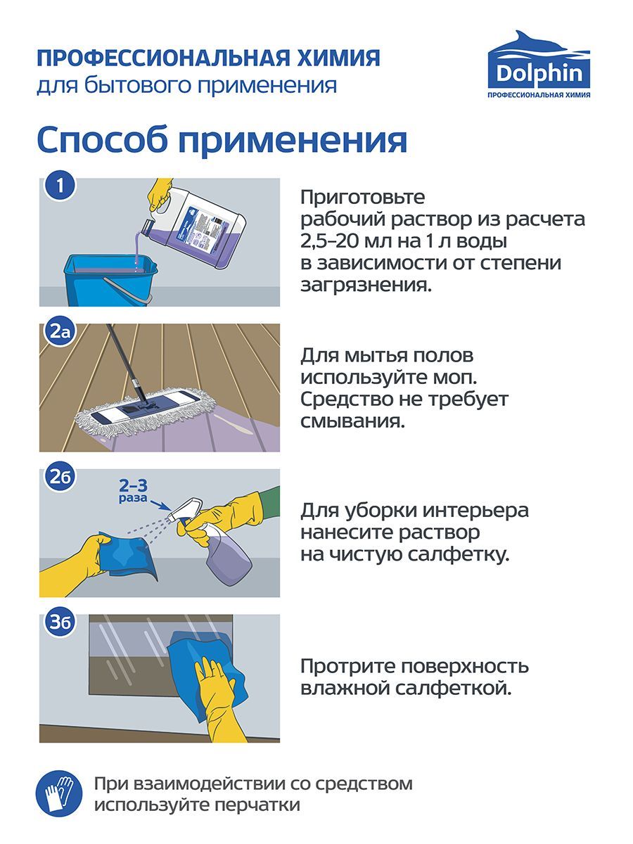 Средство для ручной и машинной уборки. Используется в виде водного раствора в концентрации 2,5–20 мл на 1 л воды в зависимости от степени загрязнения и способа применения. Не требует смывания.