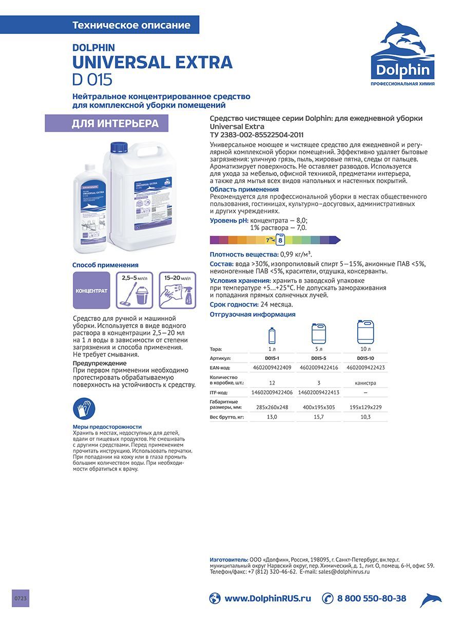 Описание: Универсальное моющее и чистящее средство для ежедневной и регулярной комплексной уборки помещений. Эффективно удаляет бытовые загрязнения: уличную грязь, пыль, жировые пятна, следы от пальцев. Ароматизирует поверхность. Не оставляет разводов. Используется для ухода за мебелью, офисной техникой, предметами интерьера, а также для мытья всех видов напольных и настенных покрытий.