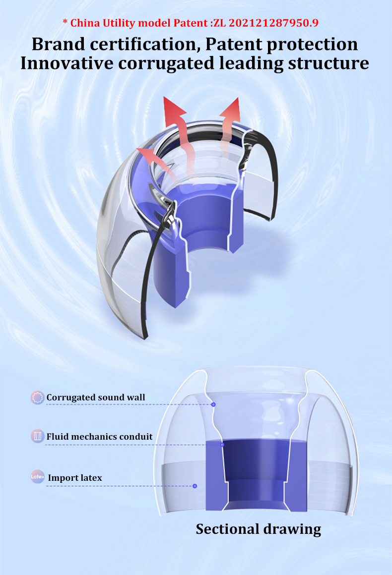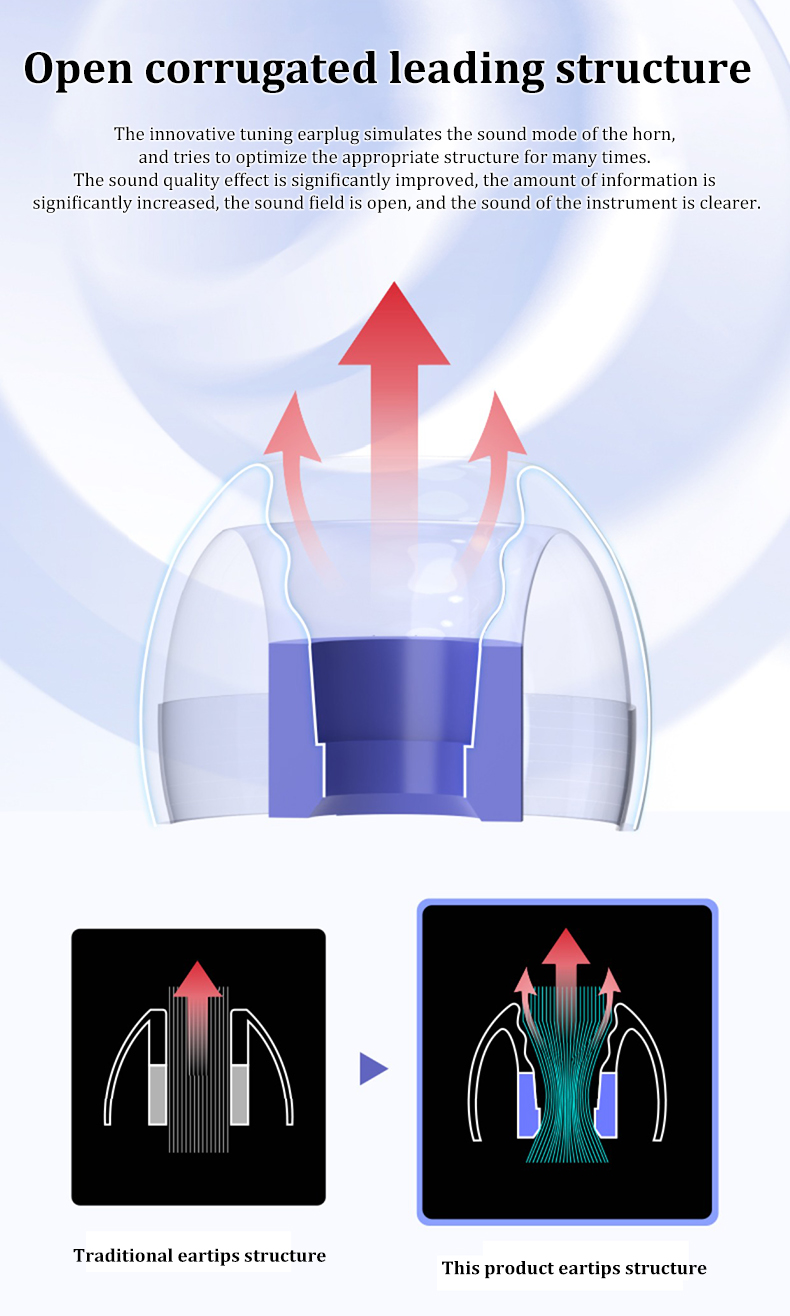 -Открытая гофрированная ведущая конструкция. Инновационная тюнинговая затычка для ушей имитирует звуковой режим рожка и пытается много раз оптимизировать соответствующую конструкцию. Значительно улучшен эффект качества звука, значительно увеличен объем информации, звуковое поле открыто, а звук инструмента более четкий.