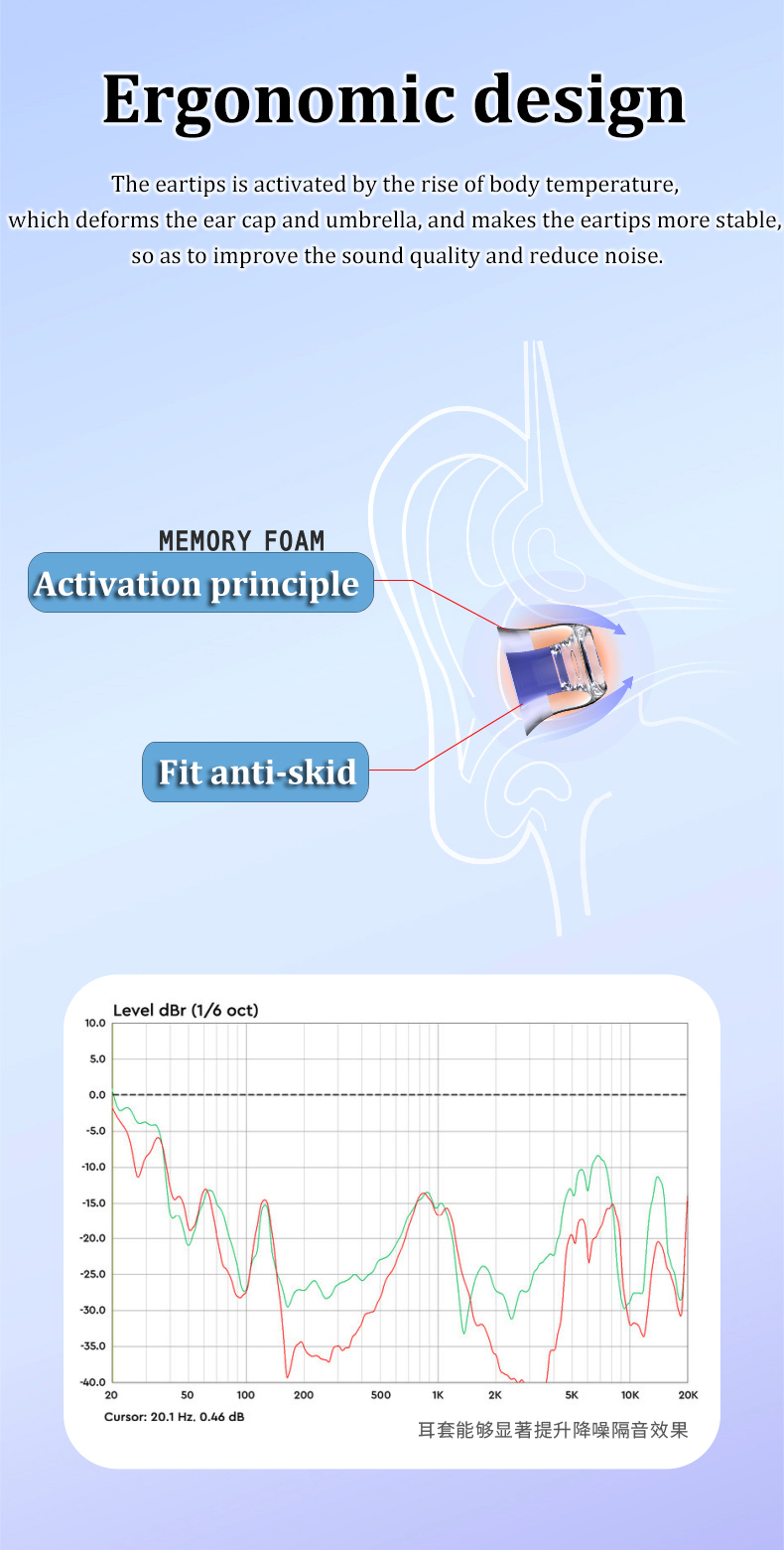 -Эргономичный дизайн. Наушники активируются повышением температуры тела, что деформирует амбушюру и зонт и делает наушники более стабильными, чтобы улучшить качество звука и снизить шум.