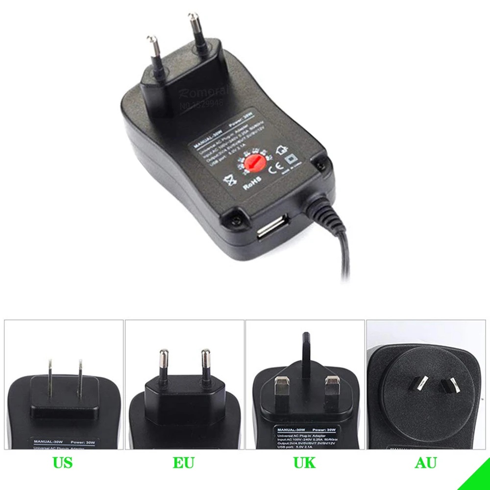 Универсальный адаптер переменного тока мощностью 30 Вт с обратной полярностью, многовольтный источник питания постоянного тока для ЖК-светодиодной ленты, маршрутизатора, концентратора динамиков, совместимый с 3-12 В, с 9 наконечниками адаптера