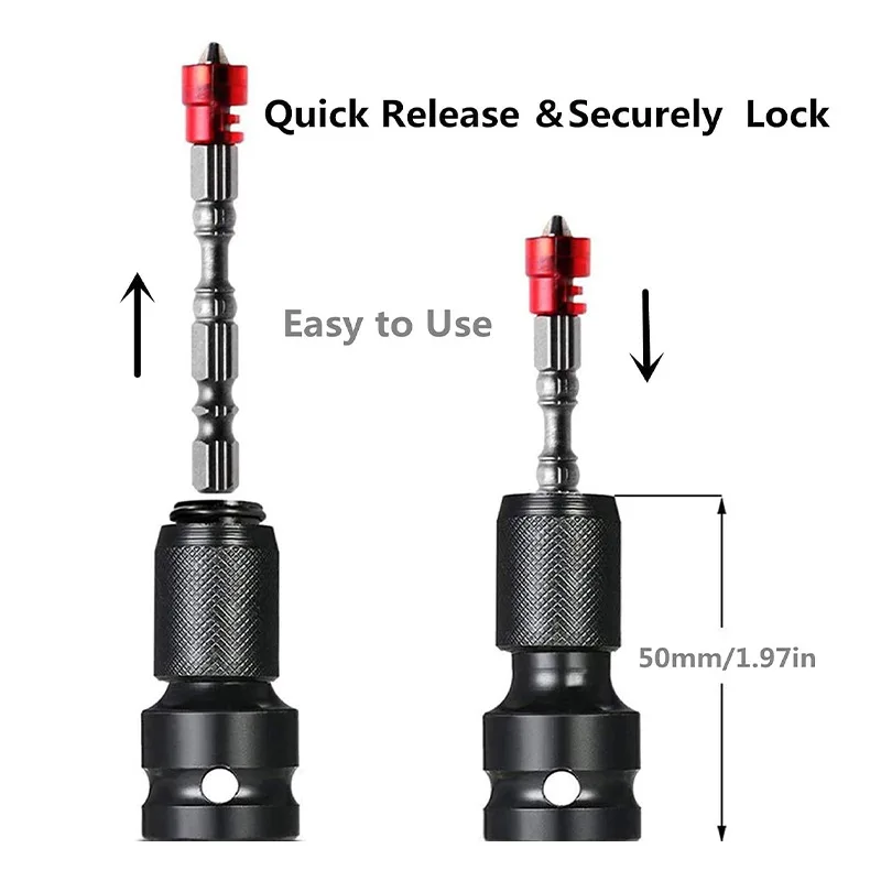 3. Быстроразъемный и безопасный замок дизайн: 1/2 дюйма квадратное гнездо на 1/4 дюйма шестигранное гнездо адаптера.