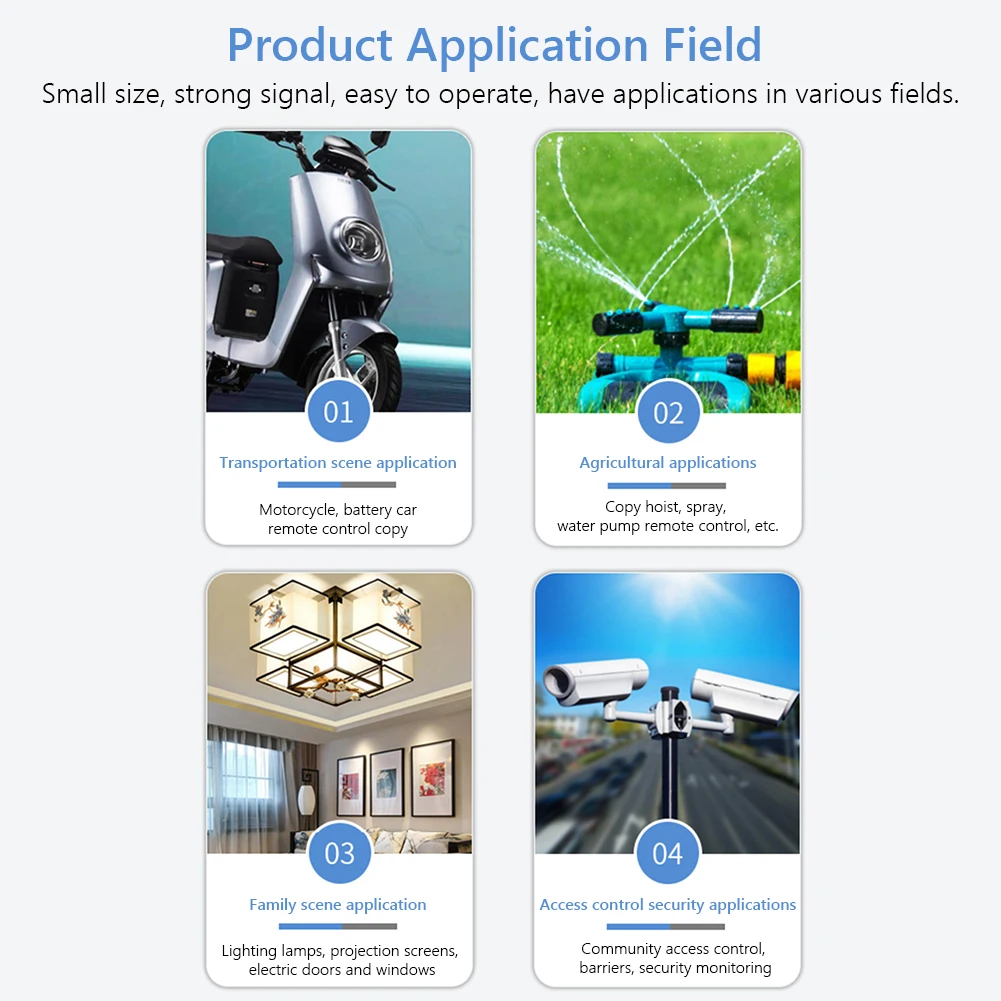 Применение: например, пульт дистанционного управления электрической выдвижной дверью, дорожными воротами, сигнализацией и т. Д.