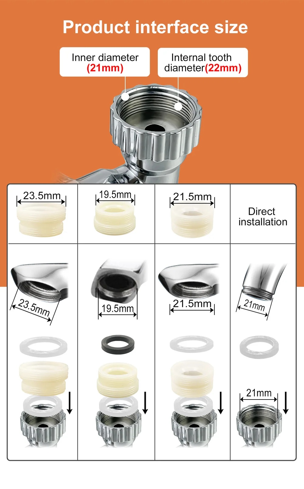【Вращающийся фильтр-смеситель 】Смеситель с фильтром для брызг добавляет воздух в поток воды, делая его богатым кислородом и приводя к более широкому распылению воды, которая не разбрызгивается по всему телу и успокаивает кожу. В отличие от стандартного удлинителя смесителя, насадка для распылителя смесителя может поворачиваться на 1080 градусов.