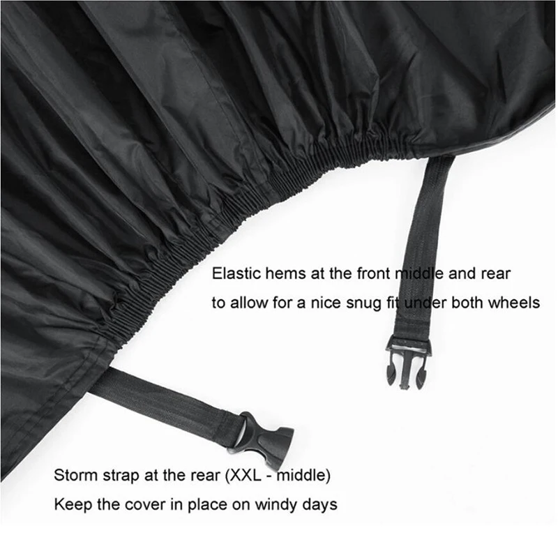 [Ремешок с пряжкой] Регулируемый нижний ремешок с пряжкой надежно удерживает чехол для велосипеда на месте, даже в жарких условиях или при неожиданных порывах ветра.