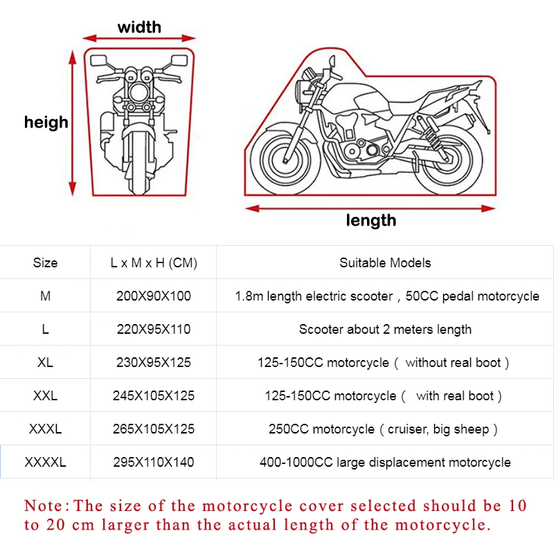 Примечание: размер крышки мотоцикла, выбранного покупателем, должен быть на 10-20 см больше фактической длины мотоцикла.
