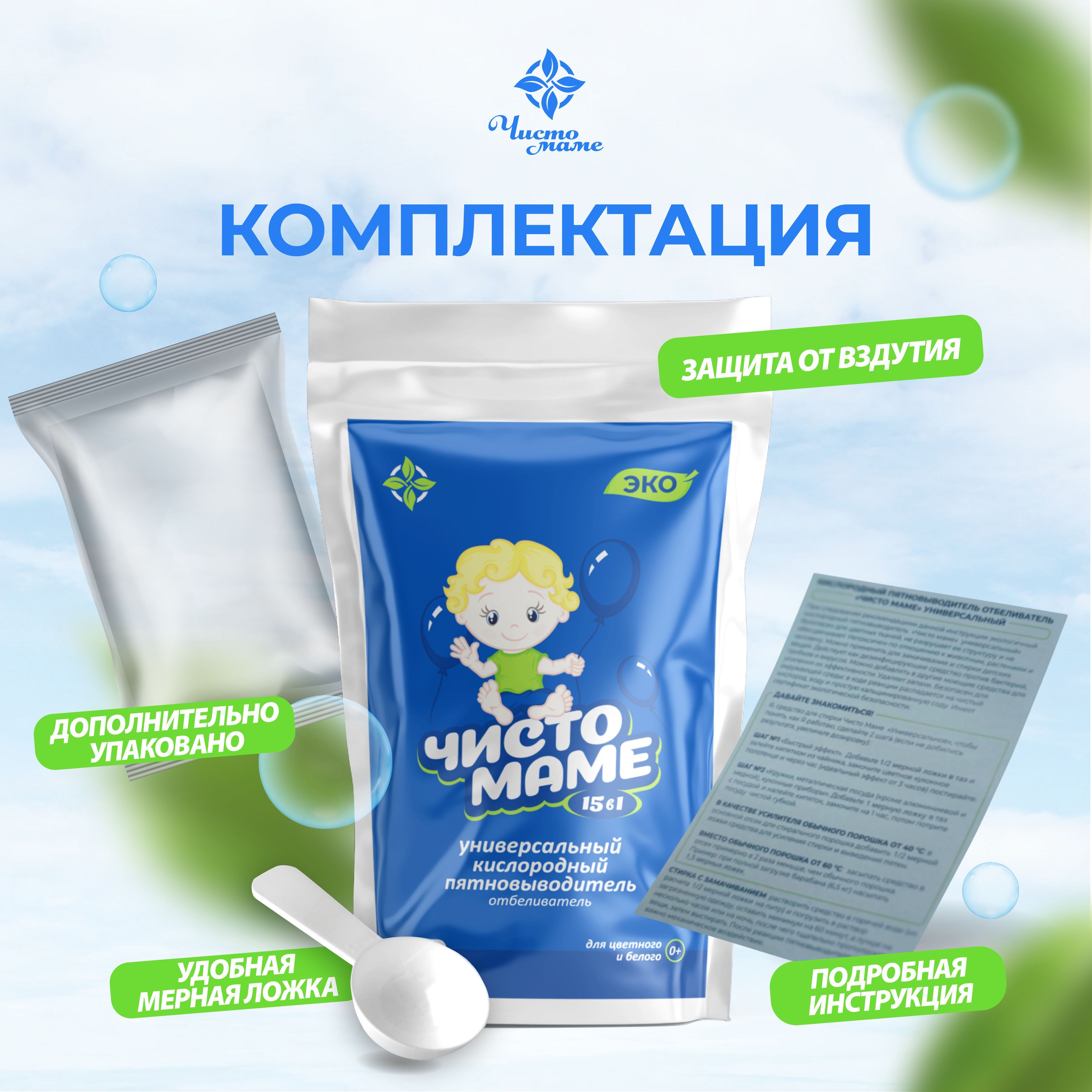 Универсальный пятновыводитель 1 кг - 1 шт., мерная ложка - 1 шт., инструкция - 1 шт.