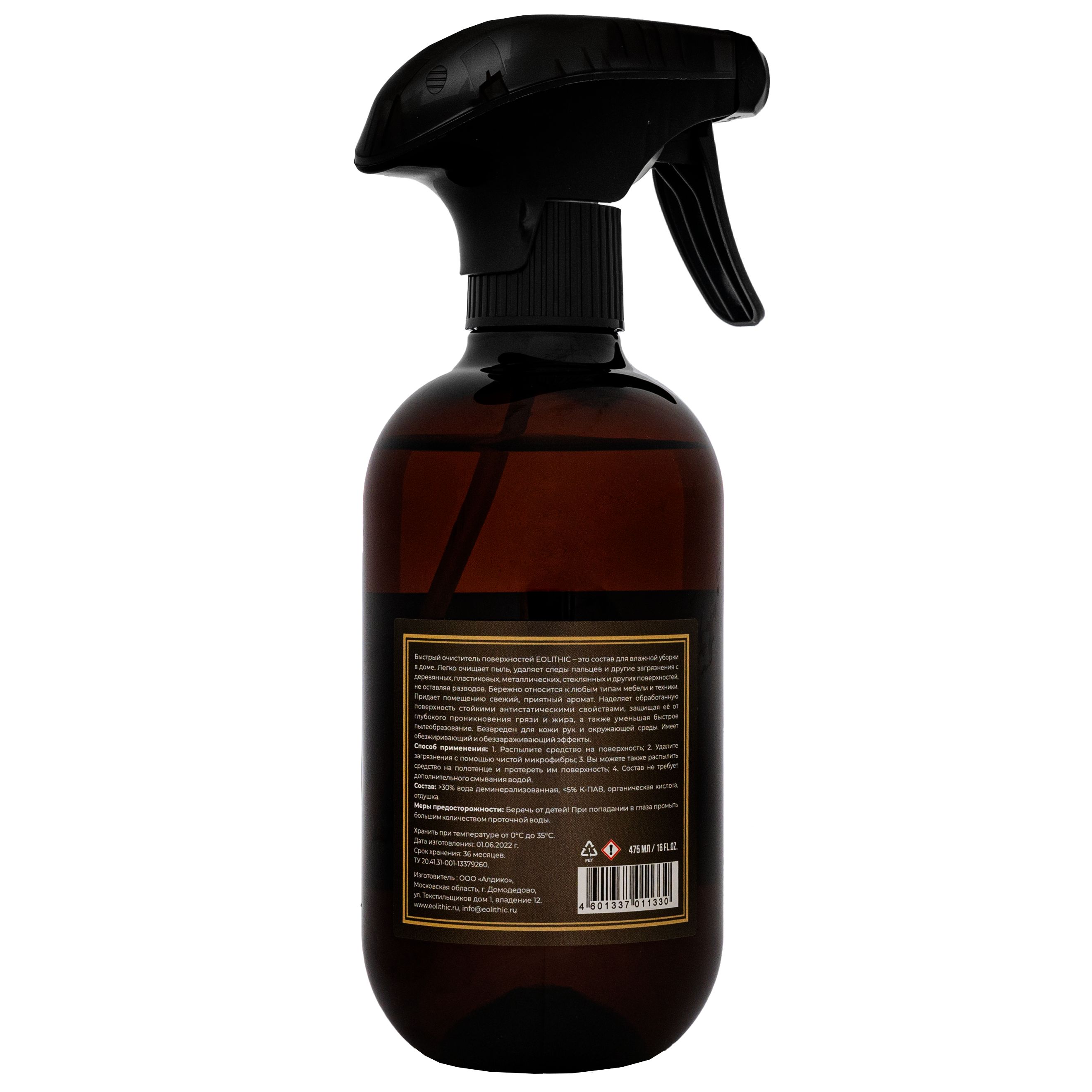 Описание: Быстрый очиститель поверхностей EOLITHIC - это состав для влажной уборки в доме. Легко очищает пыль, удаляет следы пальцев и другие загрязнения с деревянных, пластиковых, металлических, стеклянных и других поверхностей, не оставляя разводов. Бережно относится к любым типам мебели и техники. Придает помещению свежий, приятный аромат. Наделяет обработанную поверхность стойкими антистатическими свойствами, защищая её от глубокого проникновения грязи и жира, а также уменьшая быстрое пылеобразование. Безвреден для кожи рук и окружающей среды. Имеет обезжиривающий и обеззараживающий эффекты.