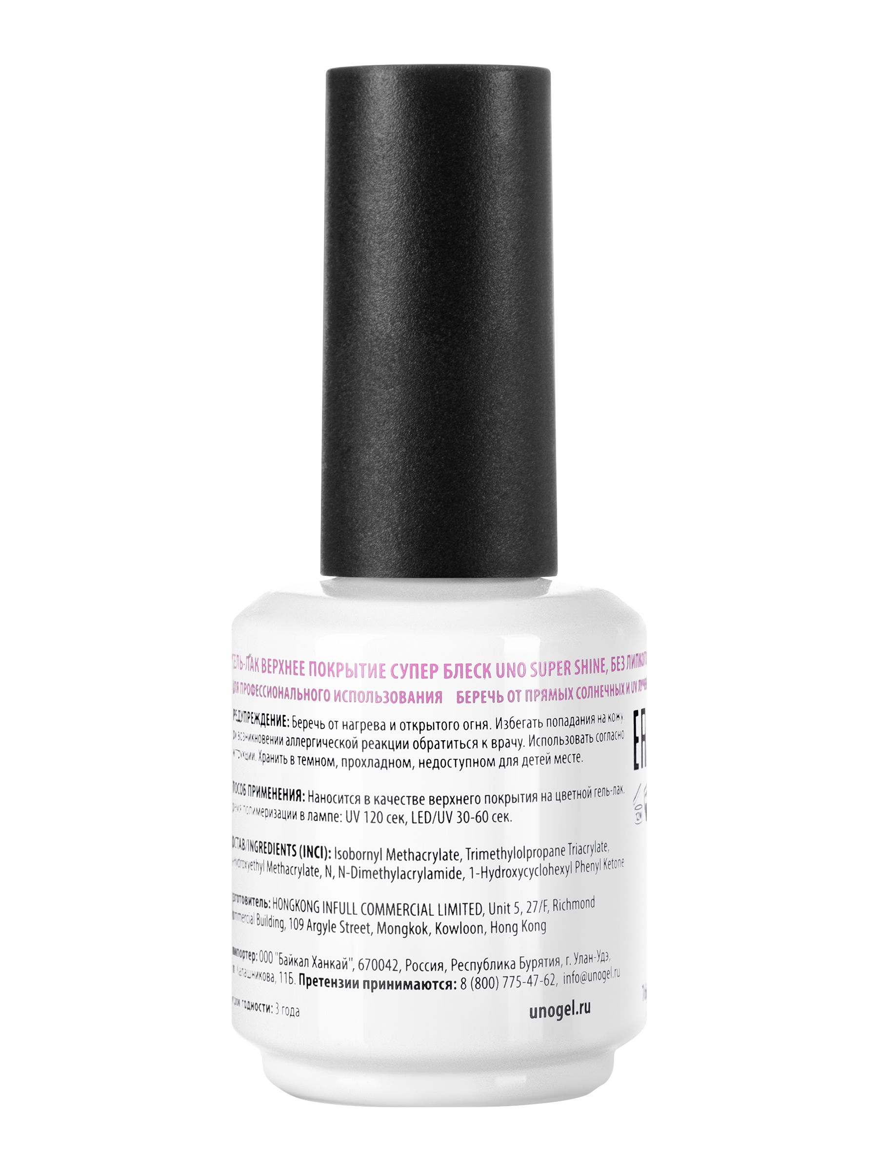 UNO Топ для гель лака "Super Shine" финиш глянцевый без липкого слоя, верхнее завершающее покрытие для ногтей, закрепитель для маникюра и педикюра, без желтизны, прозрачный, 16 г