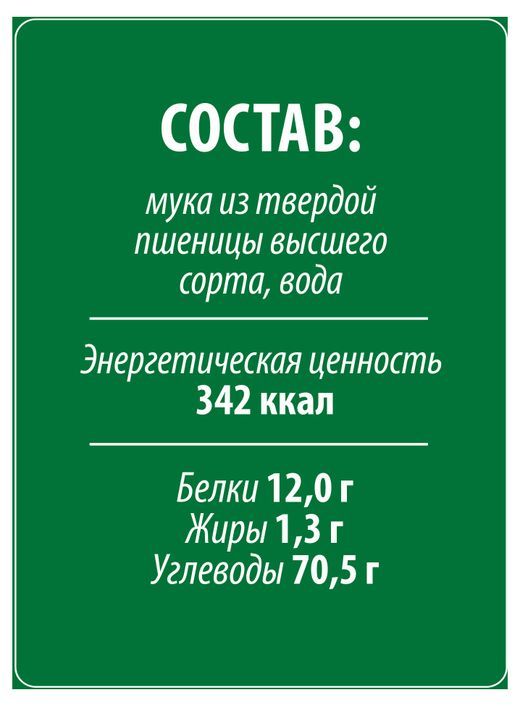 Мука из твердых сортов пшеницы для макаронных изделий высшего сорта, вода питьевая. без пищевых добавок и красителей.