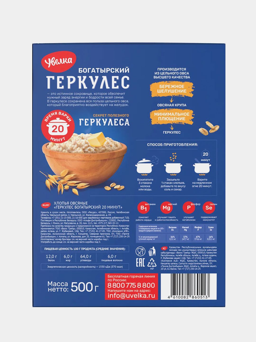 Упаковка из 6 пачек Хлопья Увелка овсяные Геркулес Богатырский (20 мин) 500г