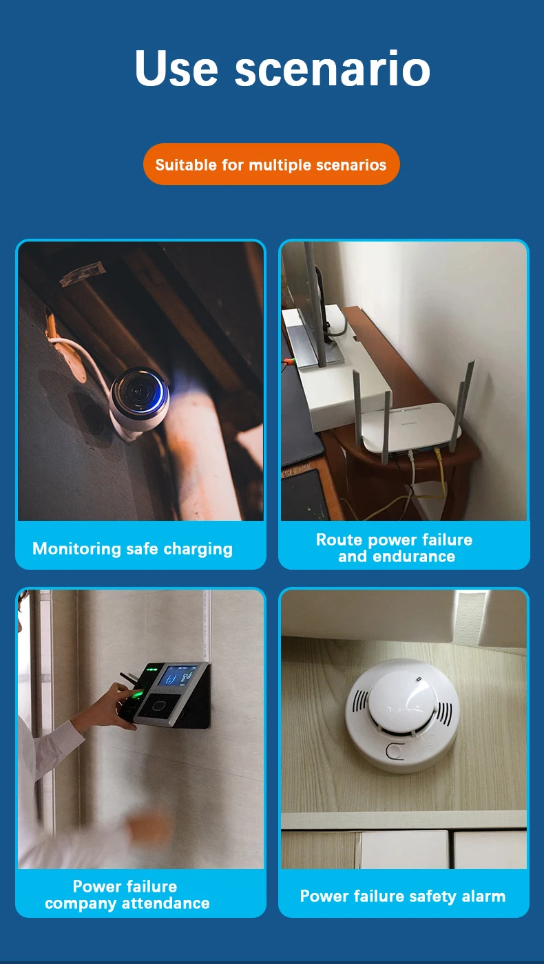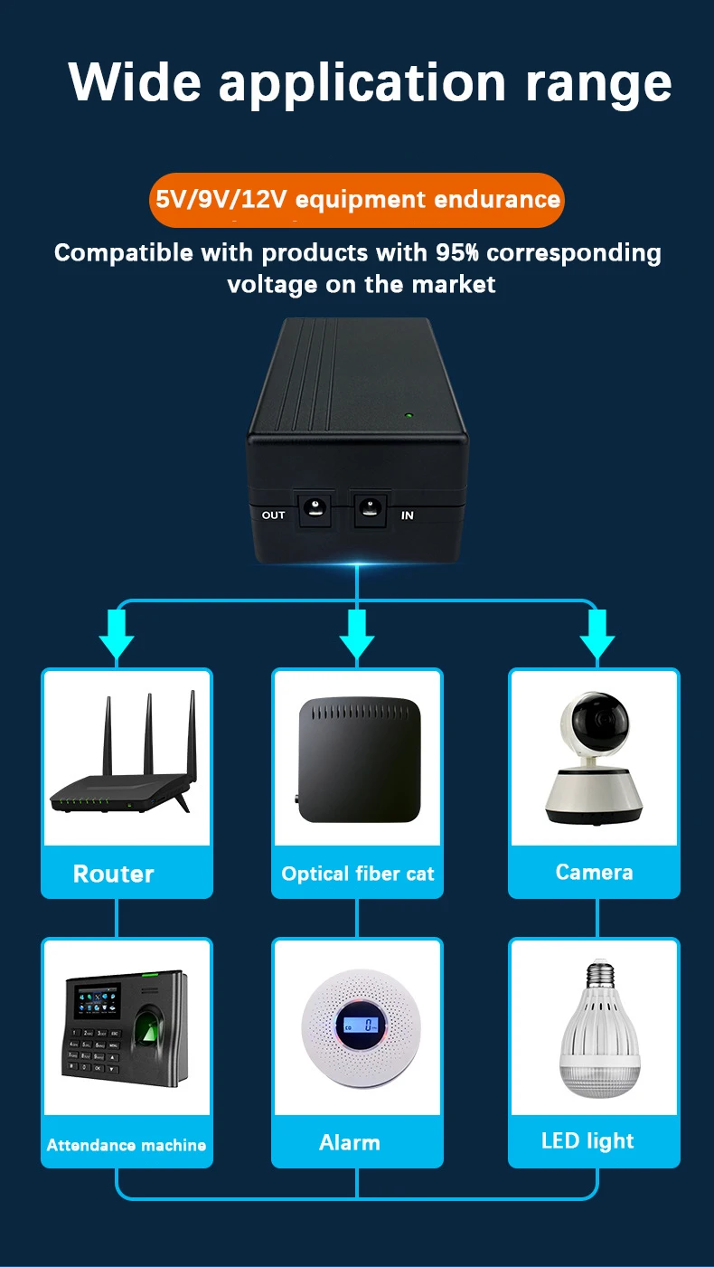 Умный мини УПС 12В широко использован в машине посещаемости отпечатка пальцев, системе мониторинга пожарной безопасности, аварийной системе запасного освещения, личной системе связи, портативной цифровой фотокамере, приборе Блуэтоотх, машине КД, машине МД, портативный DVD-плеер, MP3-плеер со смарт-картами и т. д.