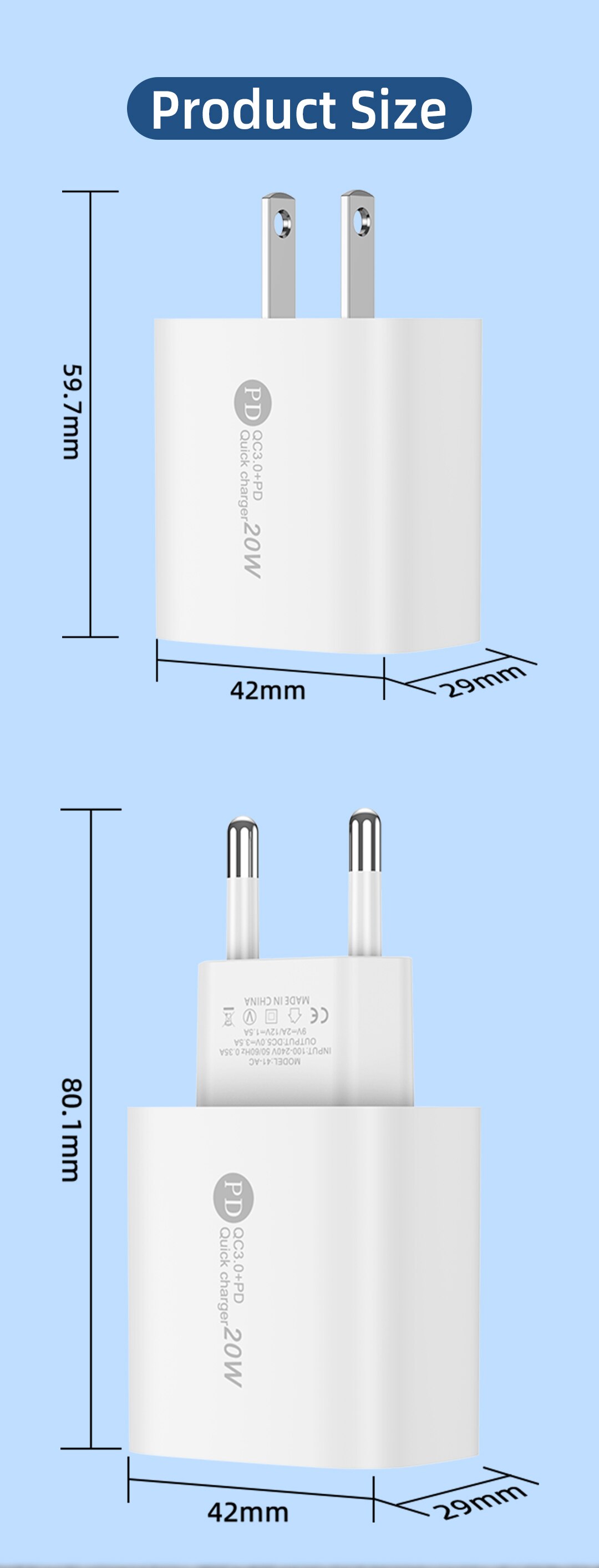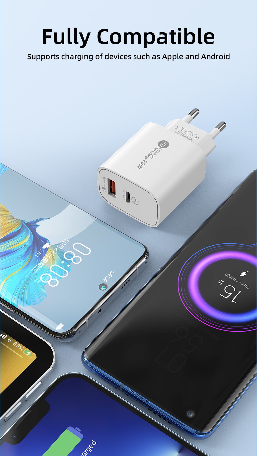 • Быстрая Зарядка:Это зарядное устройство с максимальной выходной мощностью 20 Вт может быстро заряжать ваш мобильный телефон.