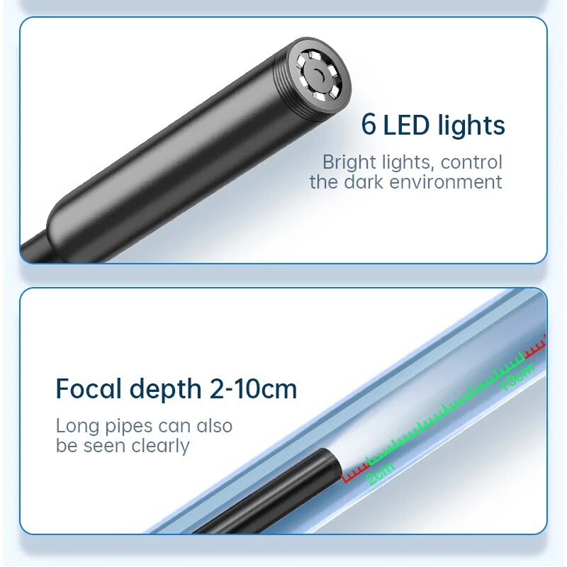 • 6 светодиодных фонарей :Этот эндоскоп с 6 светодиодными лампами обеспечивает яркое и четкое изображение проверяемого участка.