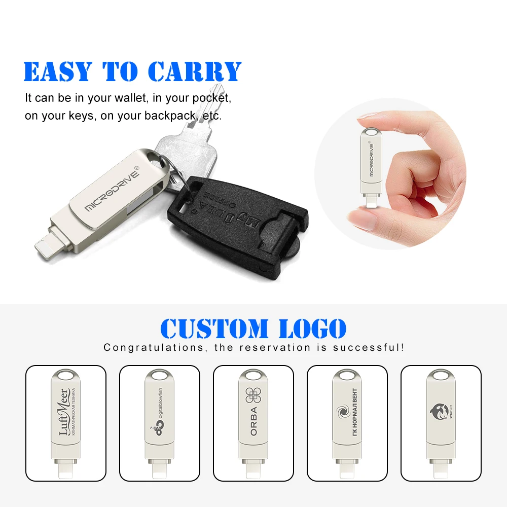 USB флеш-накопитель 2-в-1 с поддержкой OTG, USB 3,0 и Lightning, 16/32/64/128/256/512 ГБ