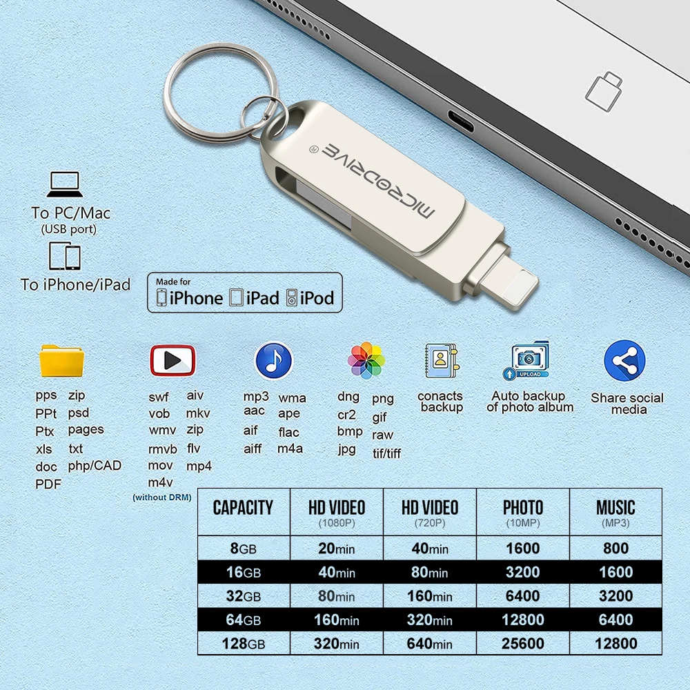 Это простая и многофункциональная карта памяти, которая может использоваться для передачи изображений/музыки/видео/документов на телефон, Mac,iPad и компьютер.