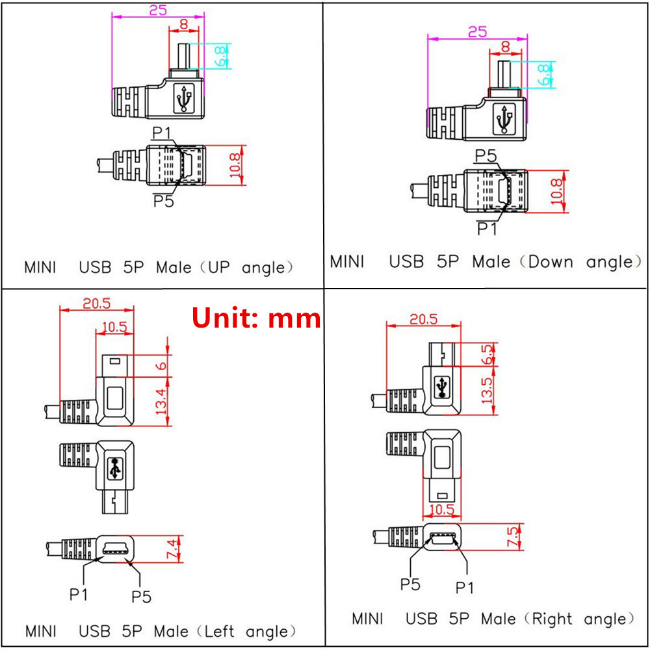 Мини-USB 5pin имеет угол 90 градусов.