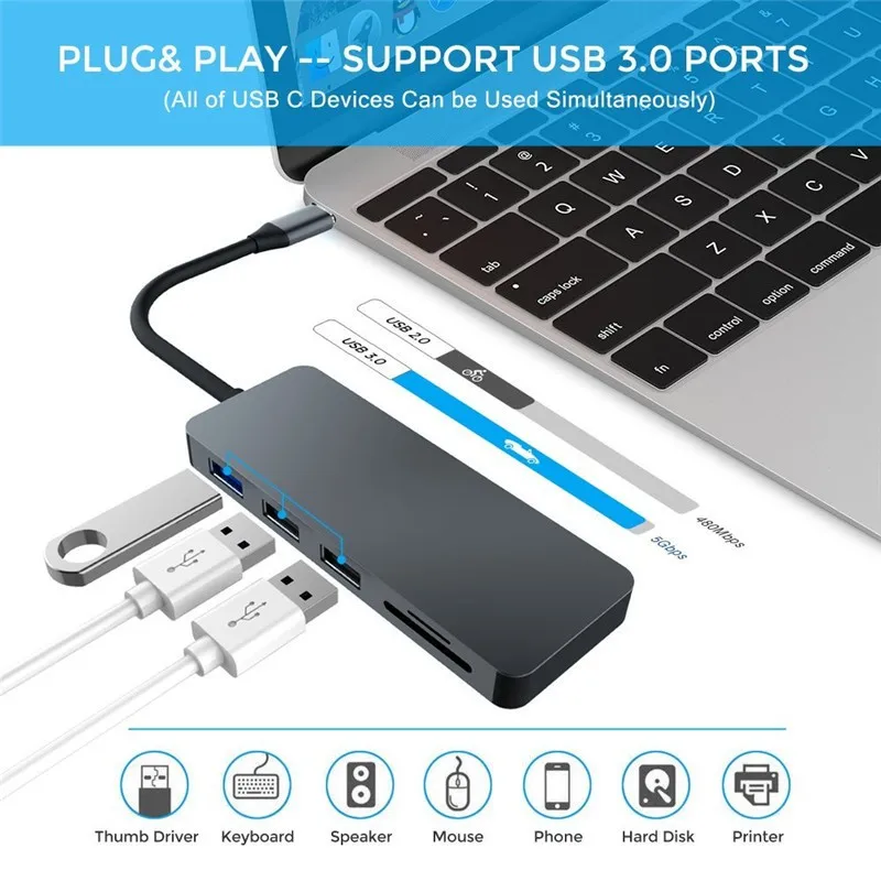 【Быстрая зарядка PD 100 Вт 】 Концентратор USB c оснащен суперинтеллектуальным чипом модернизированного поколения, порт зарядки типа C может передавать мощность до 100 Вт на устройство с питанием USB-C и обеспечивать дополнительную мощность для жестких дисков, DVD-приводы и аксессуары, подключенные к USB-порту. Больше не беспокойтесь о том, что ваше устройство разрядилось