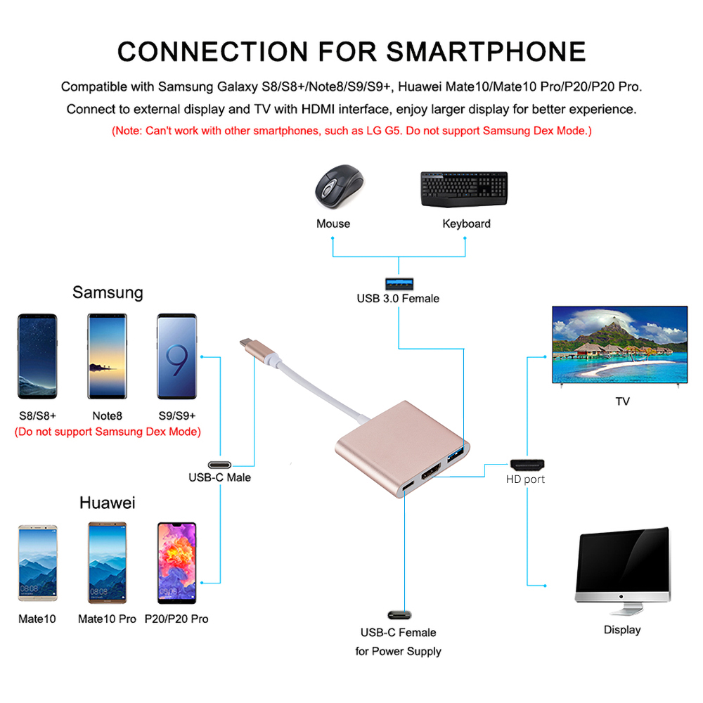 Это разъем Type-C-USB 3,0 с HDMI и концентратором порта зарядки Type C. Порт USB 3,0 позволяет подключать USB-устройство к хост-компьютеру или другому концентратору, женский порт USB-C может заряжать хост-компьютер, а порт HDMI (режим DP Alt) Позволяет подключить дополнительный монитор, чтобы вы могли смотреть видео или слайд-шоу на большом экране. Он может работать для Macbook или для нового Chromebook Pixel Google и других устройств с поддержкой Type-C.