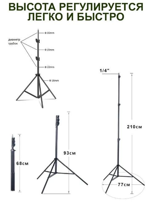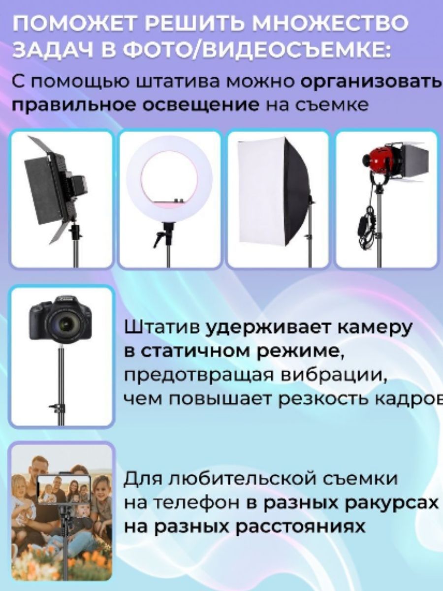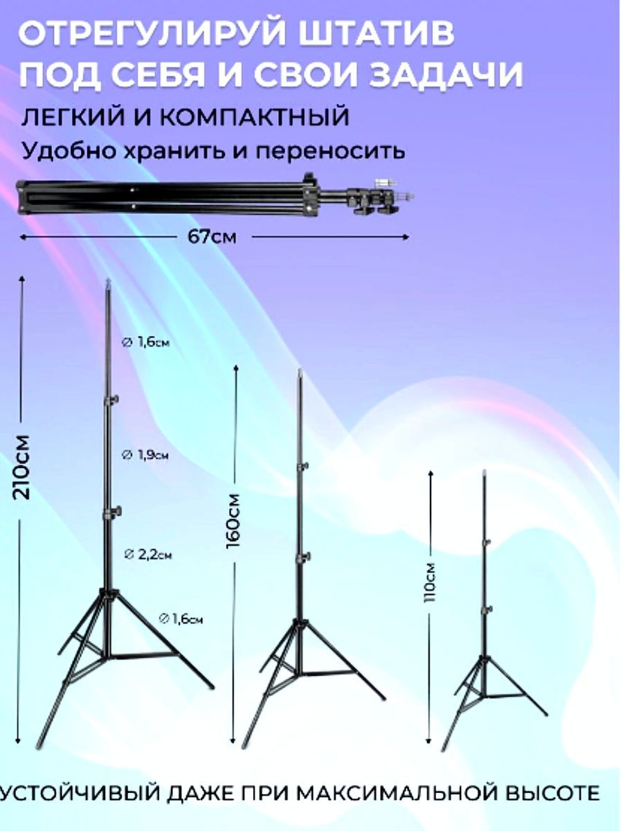 Штатив для съемки изготовлен из высококачественных материалов. Поэтому Штатив для мобильного телефона не только рассчитан на длительный срок службы, но и обеспечивает стабильность и поддержку, необходимые для съемки потрясающих фотографий и видео. Его регулируемые ножки и шаровая головка позволяют установить идеальный угол и наклон для вашего снимка, предоставляя вам полный творческий контроль. Штатив телескопический 210 см достаточно высок, чтобы помочь вам запечатлеть потрясающие пейзажи и красивые предметы с разных ракурсов.