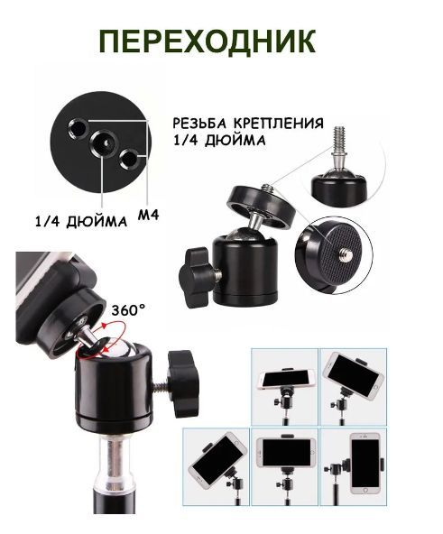 Штатив для телефона напольный - 1шт. Шаровая головка 360° - 1шт. Держатель для смартфона - 1шт. Коробка с пузырчатой пленкой - 1шт.