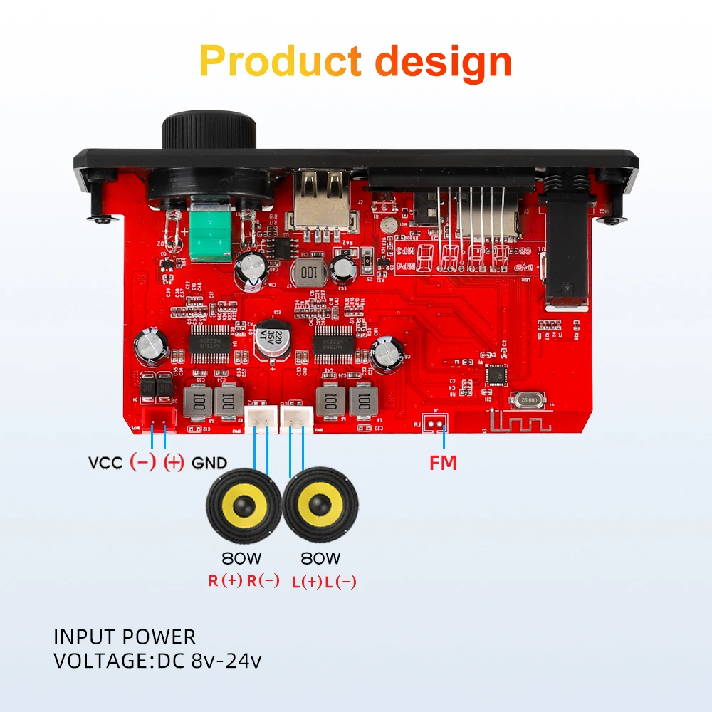 Введение функции поддержки: Поддержка MP3 / USB / TF / LINE IN / FM / BLUETOOTH/подключение дистанционного управления/5 В постоянного тока или 12 В (опционально)