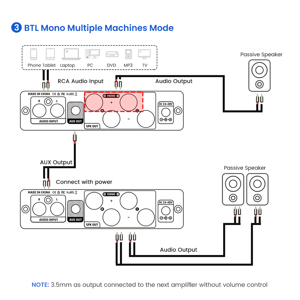 Поддерживаемые устройства ввода: мобильный телефон, планшет, компьютер, MP3, телевизор и т. Д. Устройства вывода: пассивный динамик, усилитель мощности, активный динамик