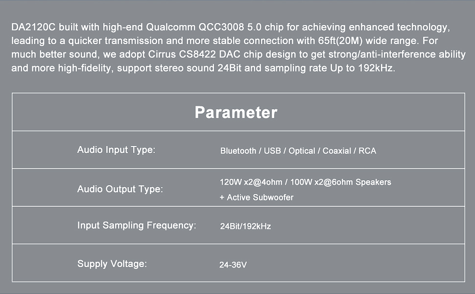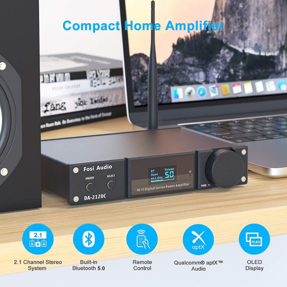 Fosi Audio DA-2120C-это усилитель канала hi-res Bluetooth с функцией 2,1 W x2 стерео беспроводного потока aptX, 24 бит/120 кГц, компактный мини-усилитель мощности, оснащенный встроенным USB-коаксиальным оптическим входом ЦАП, поддержкой сабвуфера и пультом дистанционного управления для переключения различных режимов и эквалайзера, чтобы наслаждаться музыкой в высоком разрешении! Мы предлагаем 24-месячную гарантию и дружелюбное обслуживание клиентов!