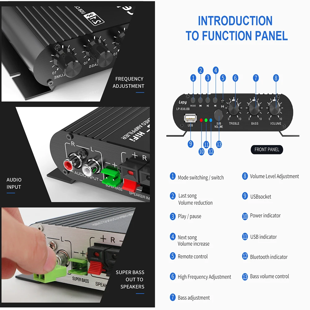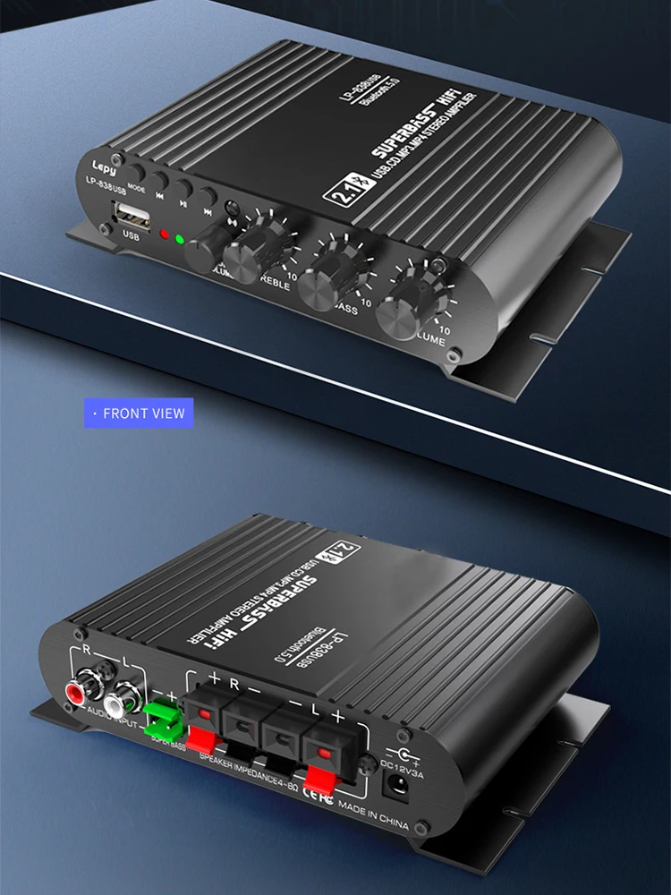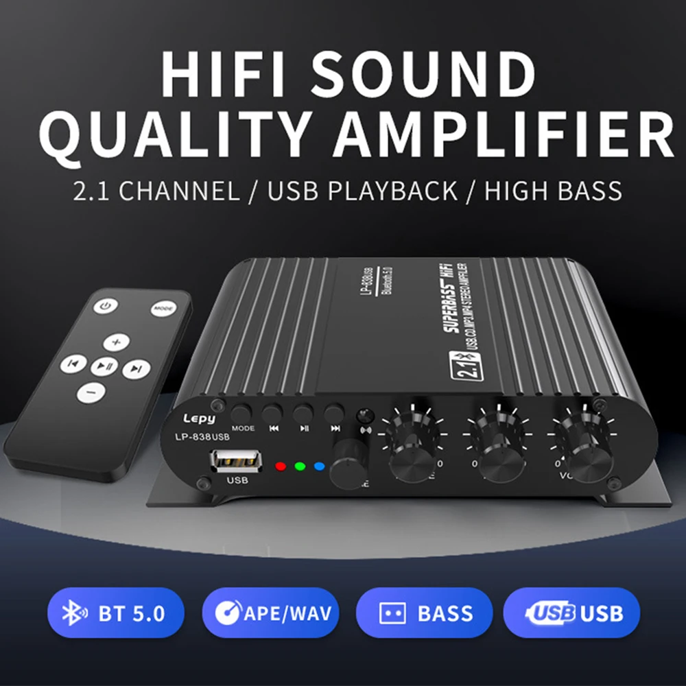 Усилитель LEPY838 Mini Audio HiFi Bluetooth 5.0 класса мощности, цифровой усилитель Tpa3116, домашняя аудиосистема 50 Вт * 2, морской USB/AUX вход