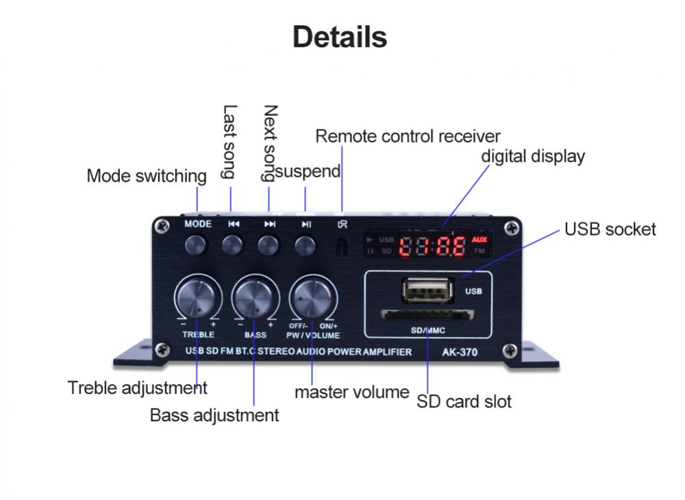 -Для SD-карты, U-диска, входа AUX, воспроизведения в формате MP3, поддержки беспроводного подключения Bluetooth.
