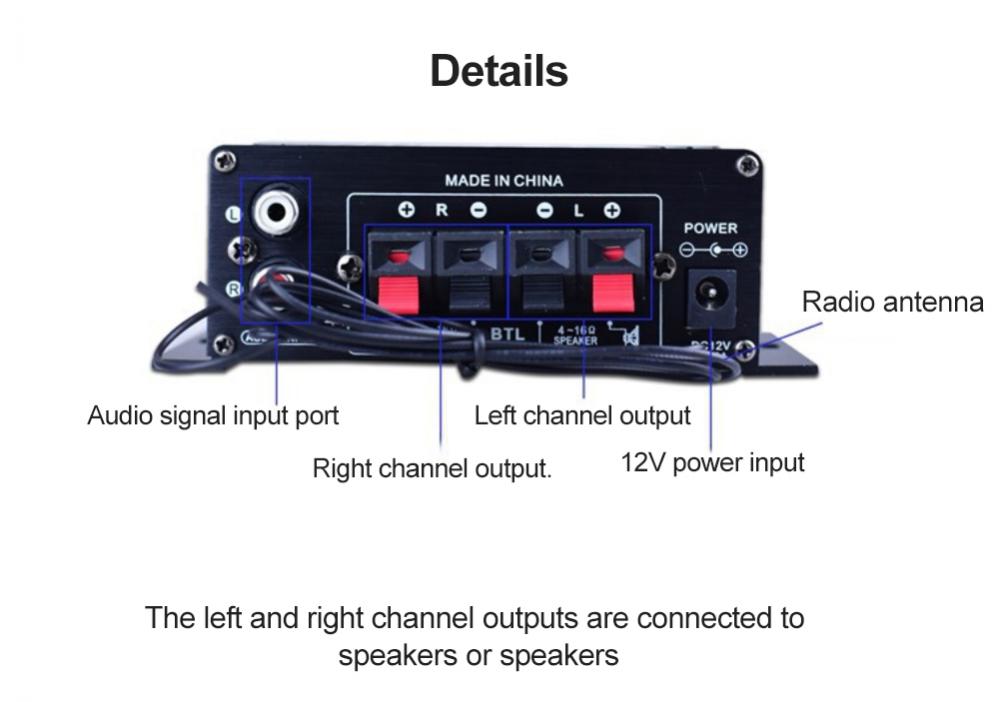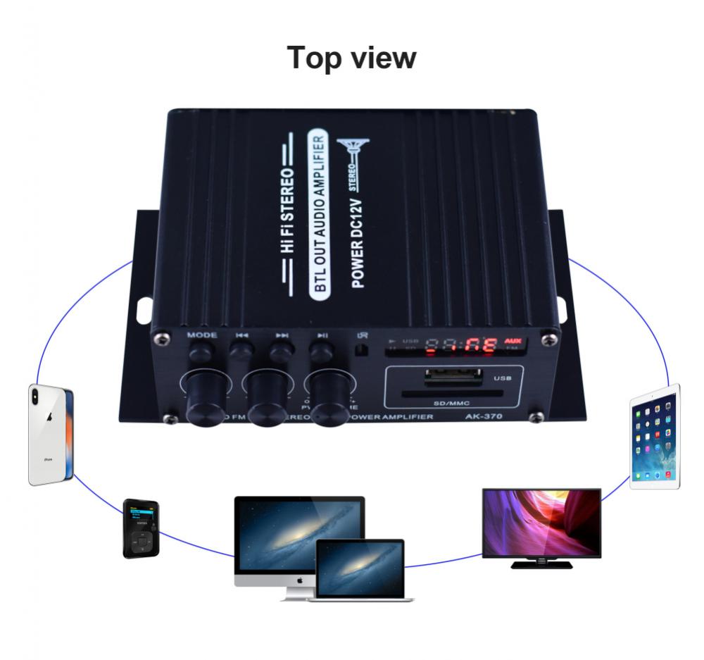 Усилитель мощности можно подключить к мобильным телефонам, компьютерам, планшетам, ноутбукам, MP3-плеерам, телевизорам и проекторам с AV-аудио (гнездо лотоса) или выходными отверстиями для наушников 3,5 мм и т. Д. Все виды мобильных телефонов на рынке могут быть подключены по Bluetooth, который может осуществлять беспроводное воспроизведение.