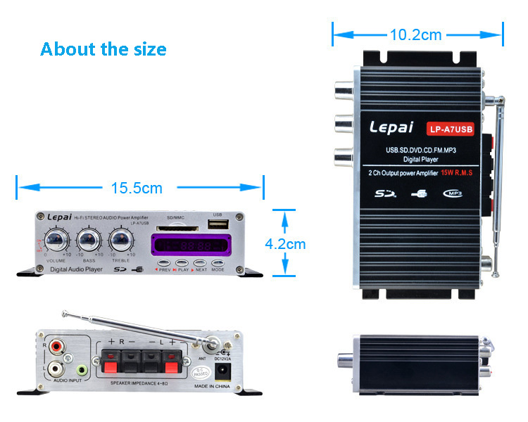 Усилитель мощности Bluetooth Lepy LP-A7USB, 12 В, 3 А, аудиокабель, многофункциональный, FM, SD, USB, MP3-плеер для дома и автомобиля