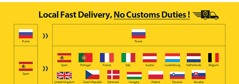 Склад в Испании/Чехии может отправить посылку в: Португалию, Францию, Германию, Италию, Австрию, Чехию, Данию, Люксембург, Нидерланды, Бельгию, Великобританию, Венгрию, Польшу, Словакию, словения Быстрая доставка Доставка 2-15 дней, Duty Free!