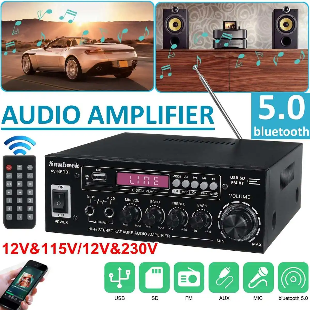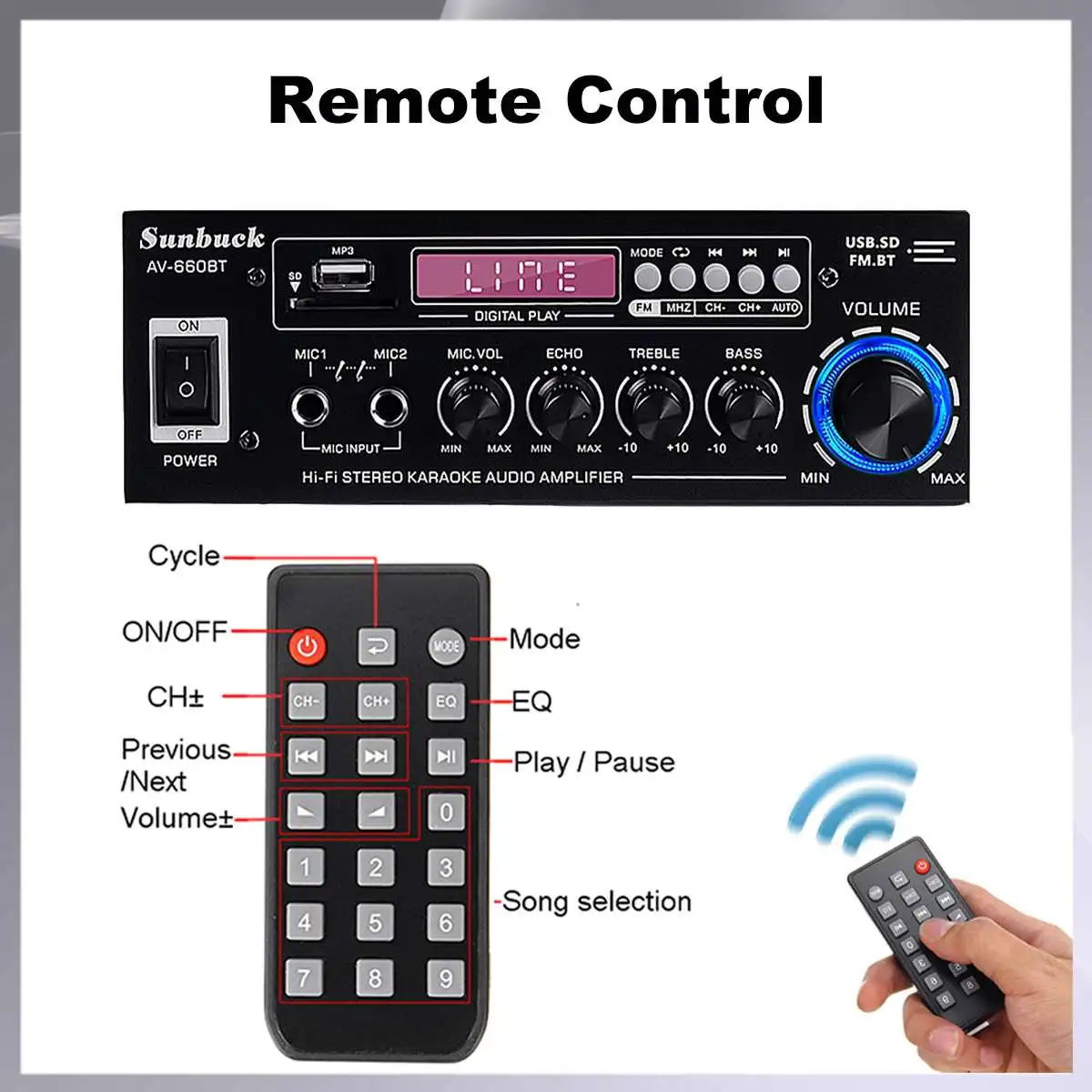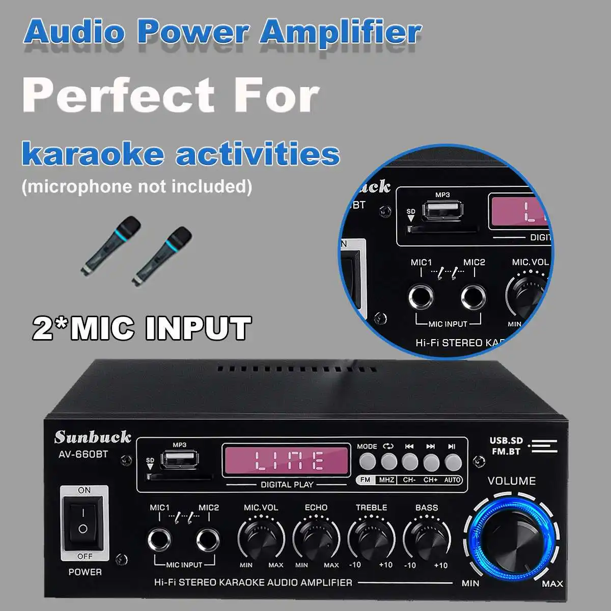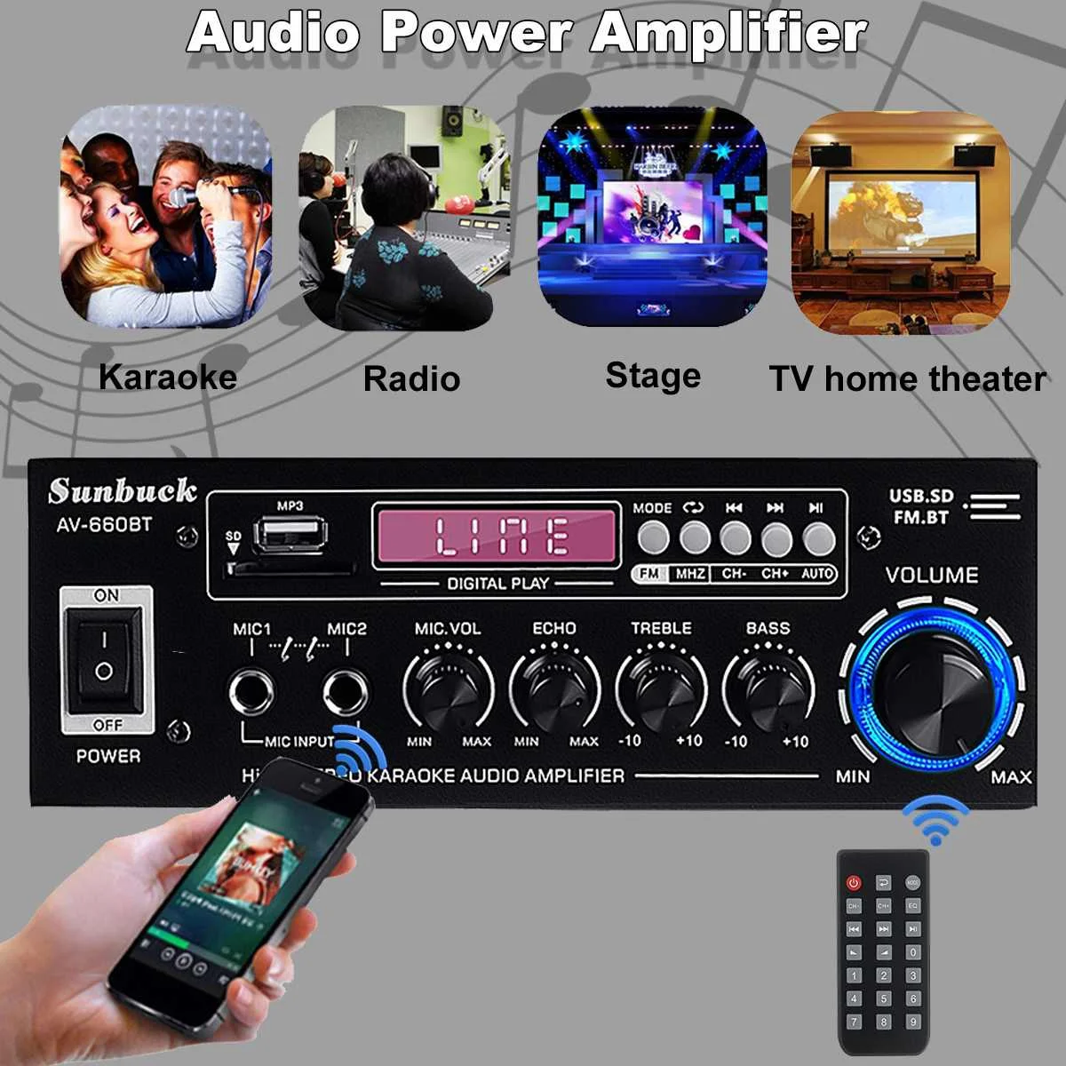 Усилитель мощности для домашнего кинотеатра, белый, 2000 Вт, 2,0 каналов, 12 В постоянного тока, 110 В/220 В, поддержка EQ, FM, SD, USB, 2 микрофона, 5,0, bluetooth