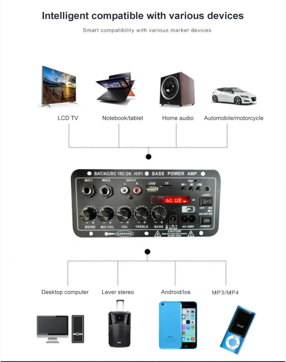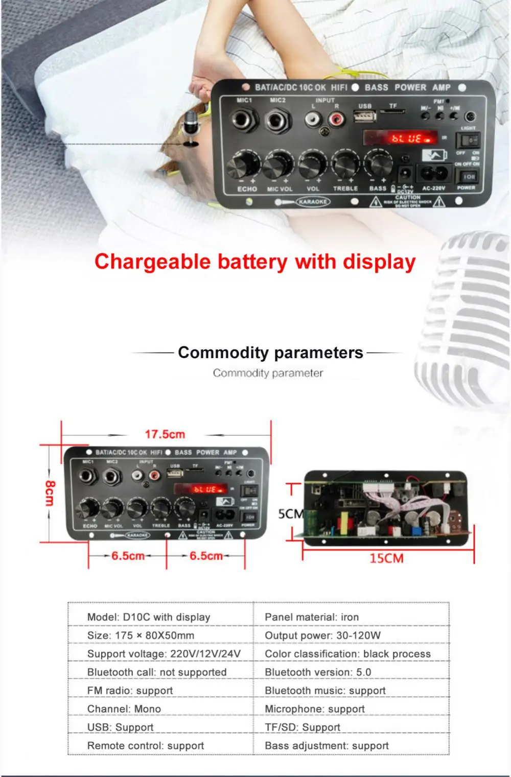 7. Двойной микрофонный вход, регулируемая реверберация; встроенный беспроводной приемник и FM-радио.
