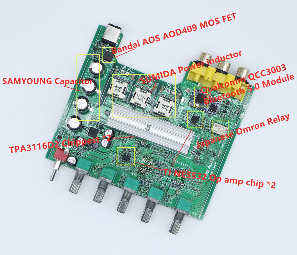 • Усилитель Bluetooth стерео принимает инструмент производительности 2pcs TexasTPA3116D2Чип усилителя, 2 шт.NE5532Чип операционного усилителя, QualcommQCC3003Модуль Bluetooth 5,0, двухканальная Максимальная выходная мощность 50 Вт x2 + 100 Вт для получения чистого звукового звука, без поп-музыки, без слышимого шума, мертвой тишины, когда через него ничего не воспроизводится.