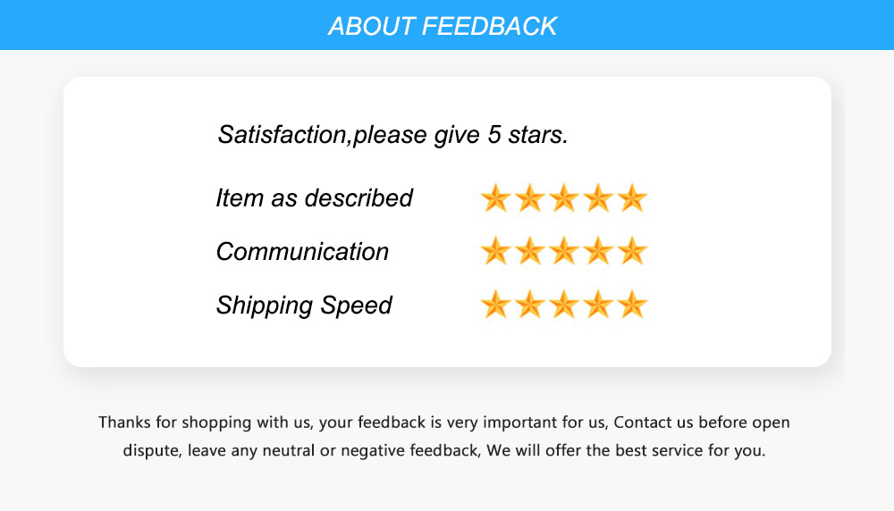 Наш успех зависит от вашего удовлетворения, поэтому ваши отзывы очень важны для нас. Если вы удовлетворены нашими продуктами и услугами, пожалуйста, оставьте нам положительный отзыв. Пожалуйста, свяжитесь с нами, прежде чем оставлять отрицательный или нейтральный отзыв, мы будем работать с вами, чтобы решить любые проблемы.