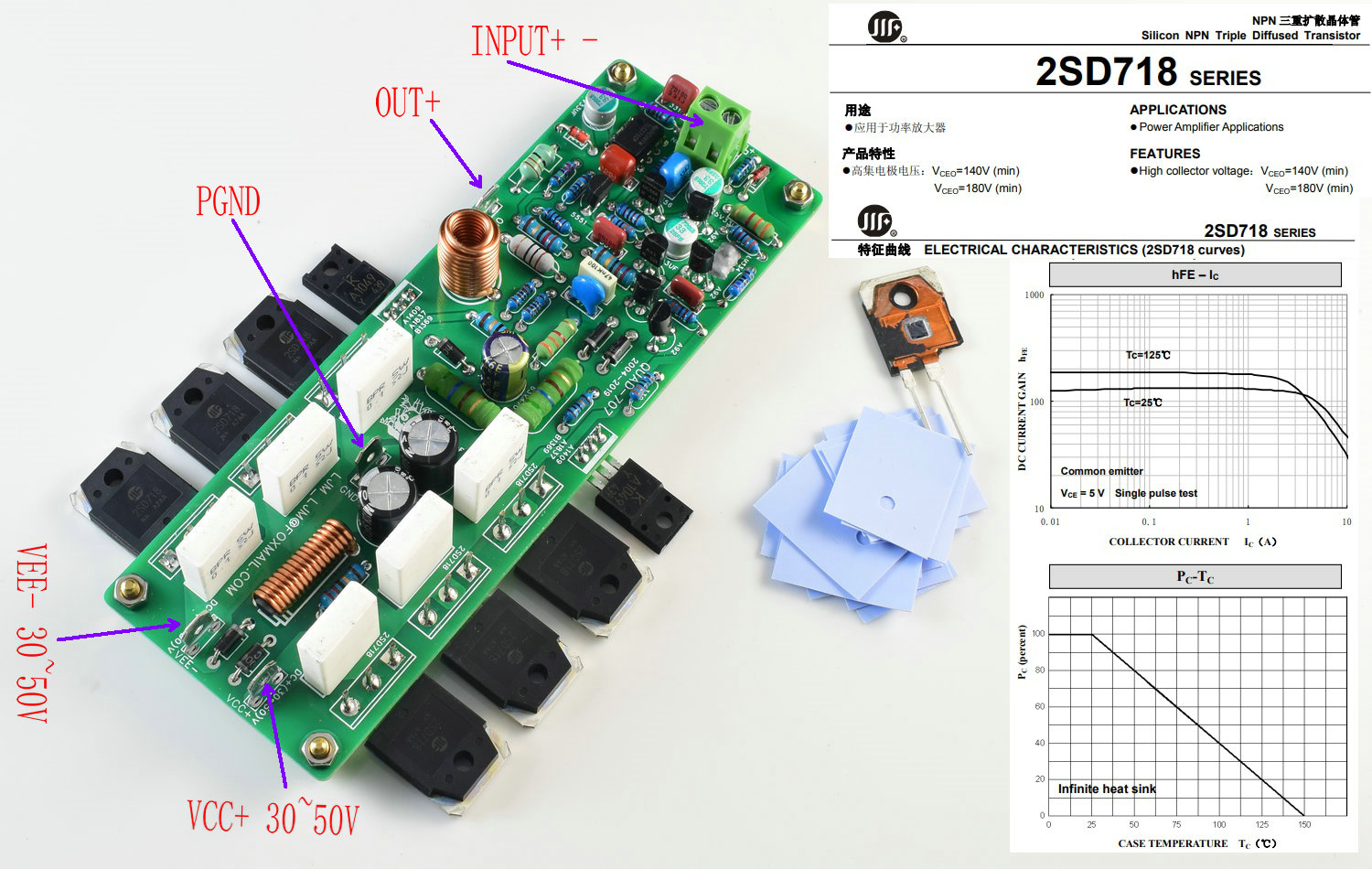 В выходном транзисторе используется оригинальная силовая трубка Hua Micro Semiconductor 2SD718 (180 В, 10 А, 100 Вт) с 6 звуковыми каналами.