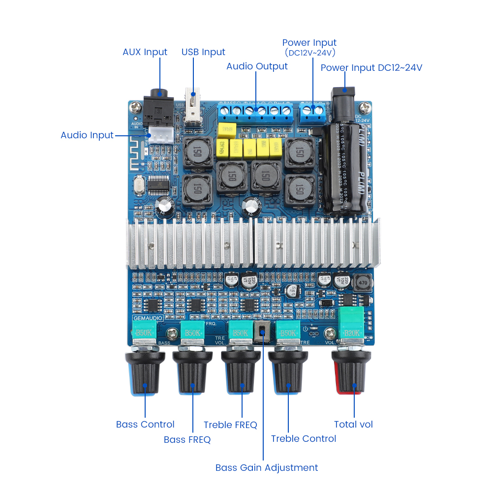 support 100W (bass channel) + 50W (left channel) + 50W (right channel) three-channel output.