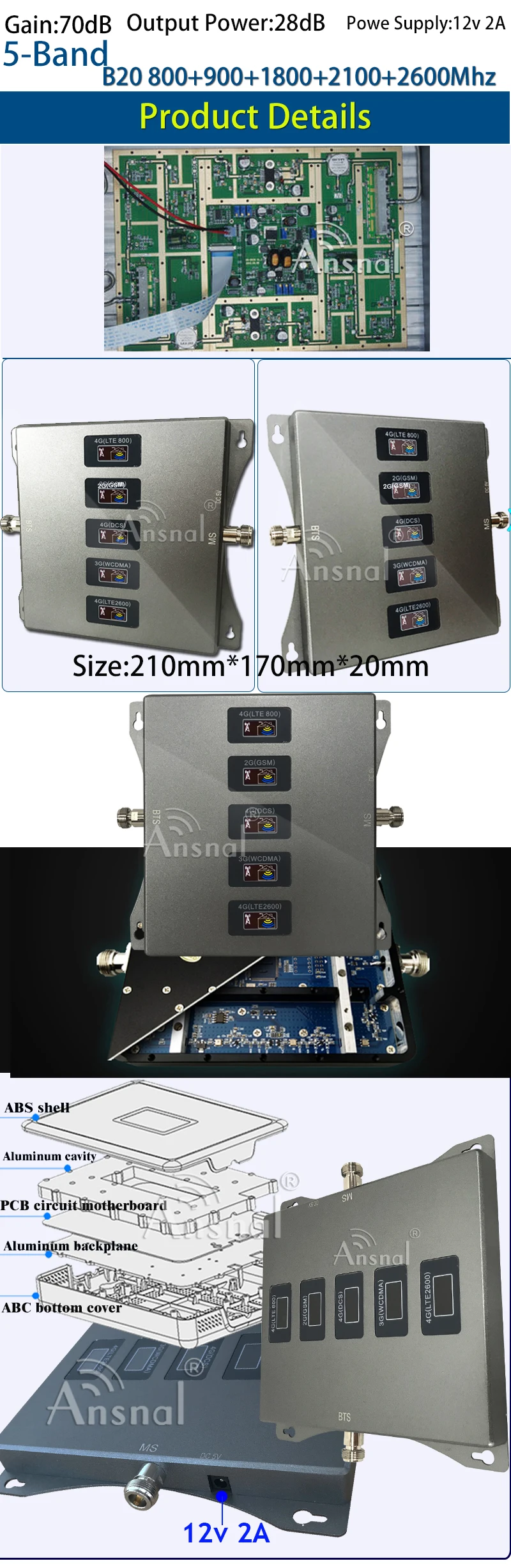 1. Только 5-диапазонный усилитель = 5-диапазонный B20 800 900 1800 2100 2600 Усилитель сигнала 4G + источник питания + руководство на английском языке