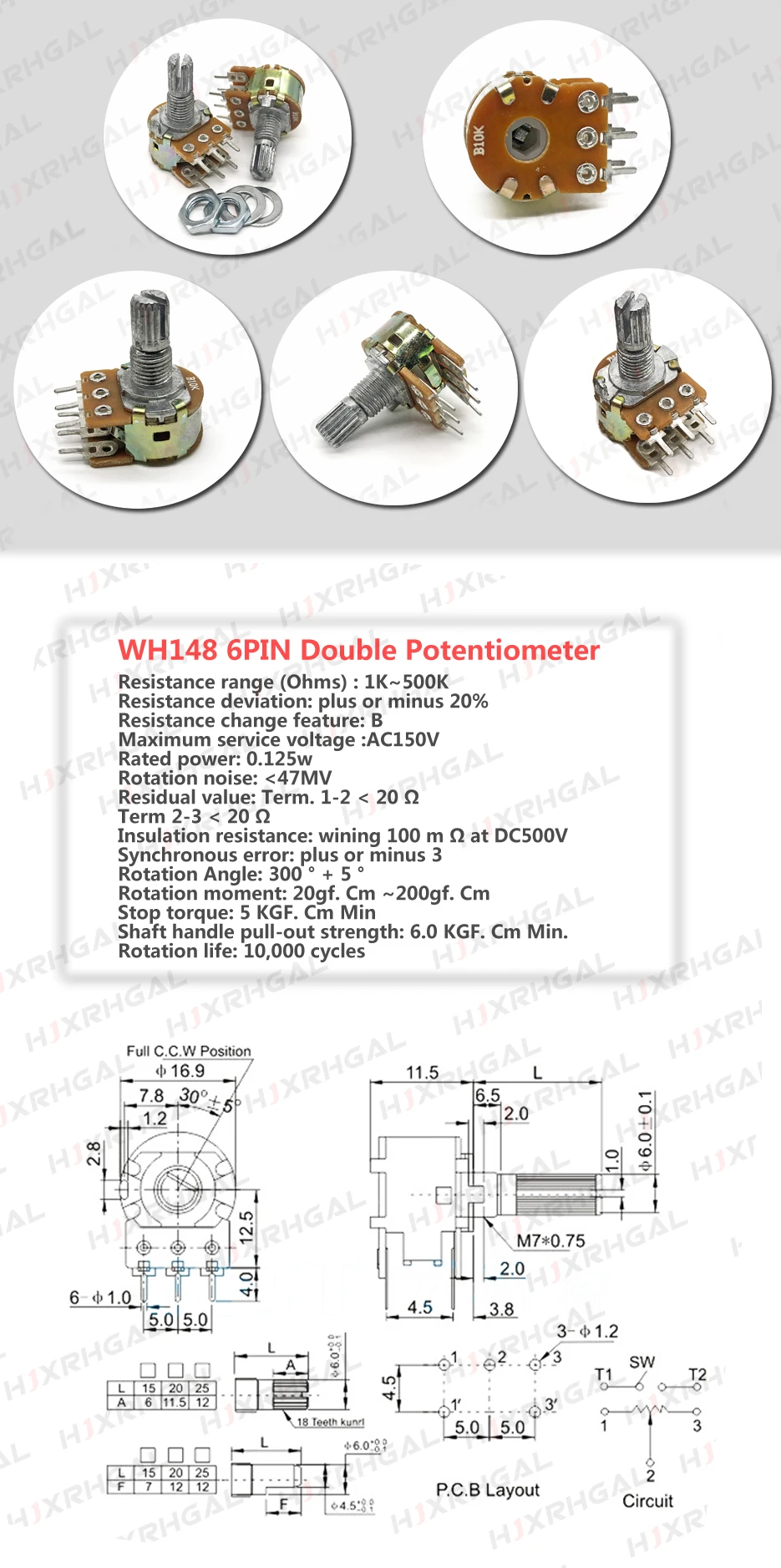 Усилитель вала WH148, B1K, B2K, B5K, B10K, B20K, B50K, B100K, B500K, 6Pin, двойной стереопотенциометр, 1 к, 2 к, 5 к, 10 к, 50 к, 100 к, 500 к, 5 шт.