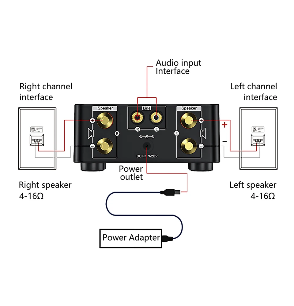 The power amplifier is a fixed-resistance power amplifier. It supports 4/6/8/16-ohm passive audio/horn. It can't be connected to computer audio and other active audio. It is not suitable for passive subwoofer. The 4 pillars behind the power amplifier are output interfaces. 3.5mm and other earphone plugs or lotus plugs