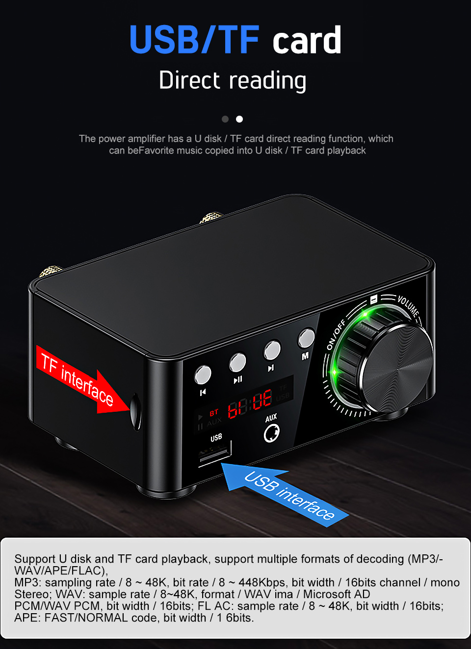 Support U disk and TF card playback, support multiple formats of decoding (MP3/WAV/APE/FLAC);